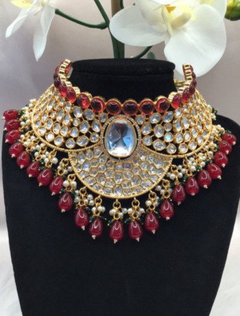 - One of the resplendent and opulent jewelries ensemble designed for brides is the Designer Kundan Choker set with Maangtika. It is a lightweight Bridal Necklace Set which fits well on the neck. Its rich colors and stunning statement look make it an exquisite choice to adorn brides by adding a touch of grandeur and elegance to their wedding attire.
