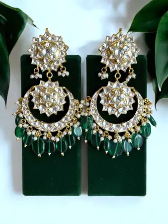 In Hindi, chand means moon, and bali refers to the earrings. Bollywood-inspired Chandbali Kundan Earrings are crafted with the design of the moon and shine as bright as it does. This piece is a blend of enduring charm and traditional design. This piece can be worn at weddings and parties to be the eye-catcher. It is handcrafted with vigilance by skilled artisans and incorporates the traditional Jadau technique of setting stones in the jewelry. The combination of colorful stones makes it a style statement, and the intricately designed piece is the main attraction of the piece, making it a kind of kundan earring.