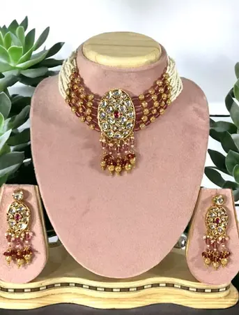 Chokers adorn your neck and elevate your entire look. They specify certain features like collarbones and necklines; it does more than you can know. They are versatile, made with intricate craftsmanship that symbolizes tradition, culture, and skills of the indian jewelry makers. For many looking for kundan jewelry, go for Kundan Choker Sets because they present soft designs to bold. This Kundan Choker Set is handcrafted with pearls, pastel pink, and gold beads. This piece is designed in authentic semi-precious kundan stone. Command the spotlight!