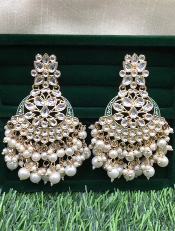 Fashionable Kundan Pearl Earrings Chandbalis with flowy georgette or chiffon sarees create a modern, airy look. Keep the look light and sublime with pearl or Kundan Chandbalis.