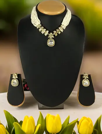 Central Kundan stone, white bead mala |