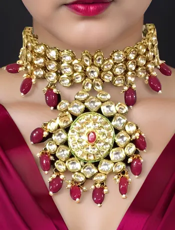 While both are traditional, Kundan necklaces are made by embedding glass stones in gold, and Polki necklaces use uncut diamonds, thus giving them a more raw and natural appeal.