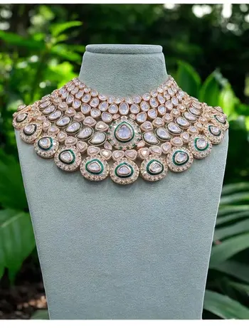 The premium bridal set features an impressive array of high-quality uncut kundan and moissanite carefully selected to create a gorgeous visual effect. From the majestic necklace to the delicate earrings, every piece is a testament to Yashti Jewelers' dedication to provide best quality handcrafted jewelry. Whether you're looking for a classic and ethnic design or a modern and contemporary twist, this range of sets is sure to exceed your expectations, providing a truly unforgettable and luxurious bridal experience.