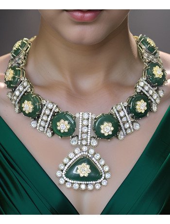 Admire the Tyaani Inspired Kundan Monalisa Tanjore Stone Necklace Set! This gorgeous combination includes a big necklace with a flower pattern and green gemstones set in gold settings. The design of the Victorian Necklace Set flows down to a magnificent triangular pendant with everlasting appeal. The earrings, which feature a large triangular pendant, mirror the necklace, creating a coherent and beautiful design. This combination is ideal for bringing a touch of antique elegance to your holiday attire, combining simplicity and class. It's a flexible piece that elevates any attire, making the artificial necklace designs suitable for both casual and festive occasions, as well as mehendi functions.