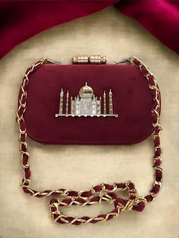 Paying homage to the architectural marvel of the Taj Mahal, this clutch is a stunning masterpiece the Taj Mahal motif designed is 24k gold plated. Designed with intricate detailing, the Taj Minaudière clutch captures the essence of royalty. The plush velvet material elevates its branded look, making it a must-have for weddings and grand festivities. For added convenience, it has an attached sling so you can turn it into a sling bag whenever you wish to!