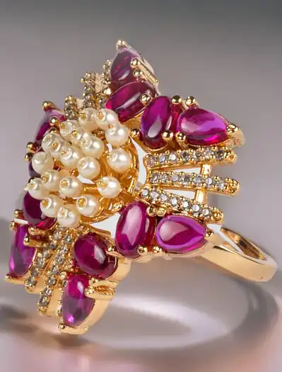 - Ruby and Emerald Green AD/CZ Fashion Ring- Our Ruby and Emerald Green AD/CZ Fashion Ring has the ideal color and sparkle for traditional and indo-western looks. The deep red ruby and vibrant green emerald are paired with shimmering cubic zirconia, making these Indian Rings With Stones a standout piece in your jewelry collection. It’s perfect for those who love bold, colorful jewelry that makes a statement with the outfits you love.
