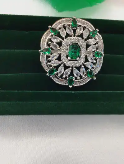- Ruby and Emerald Green AD/CZ Fashionable Ring-Add a pop of color to your jewelry collection with our Ruby and Emerald Ring. This ring combines the fiery look of rubies in the center with diamond-looking AD stones surrounded by it similarly another option has a vibrant hue of emerald stone in the center with AD stones, creating a striking piece that’s sure to turn heads. Whether you're dressing up for a special occasion and want to buy wedding rings for women or rings for parties or to add a statement piece to your everyday look, this ring is a must-have.