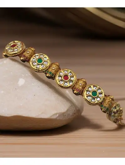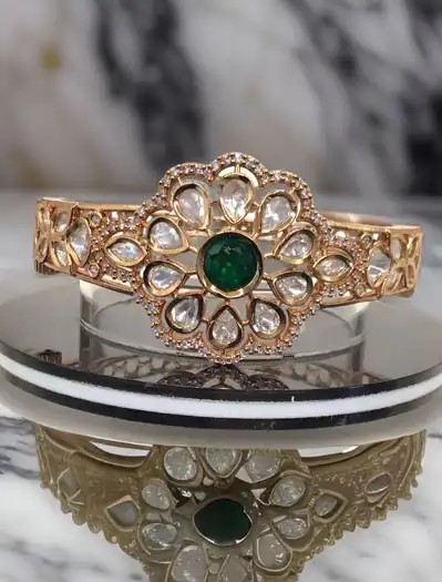 - Gold Polish Flower Design Kundan Bracelet- A designer fine quality gold polish bracelet, studded with uncut Kundan and AD enhances its look and your overall outfit. The Intricate detailing adds brilliance to the piece of jewelry. It is available in ruby and emerald gemstones and makes for a perfect choice for parties, festivals, and traditional events. Buy Kundan Bracelet Online for special occasions.
