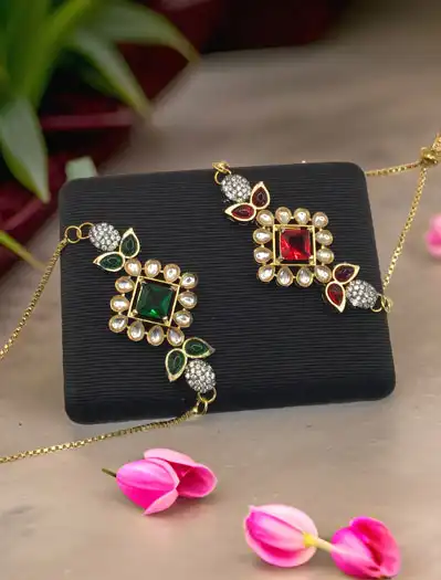 - Kundan Rakhi Bracelet in Gold Polish- The delicate Kundan Rakhi Bracelet is available in Gold Polish and is super lightweight as it is made in brass and studded with Kundan and colorful CZ stones. This is an elegant jewelry piece perfect for party wear or to elevate daily ensemble. It is available in ruby and emerald color variants, explore the collection to know more.