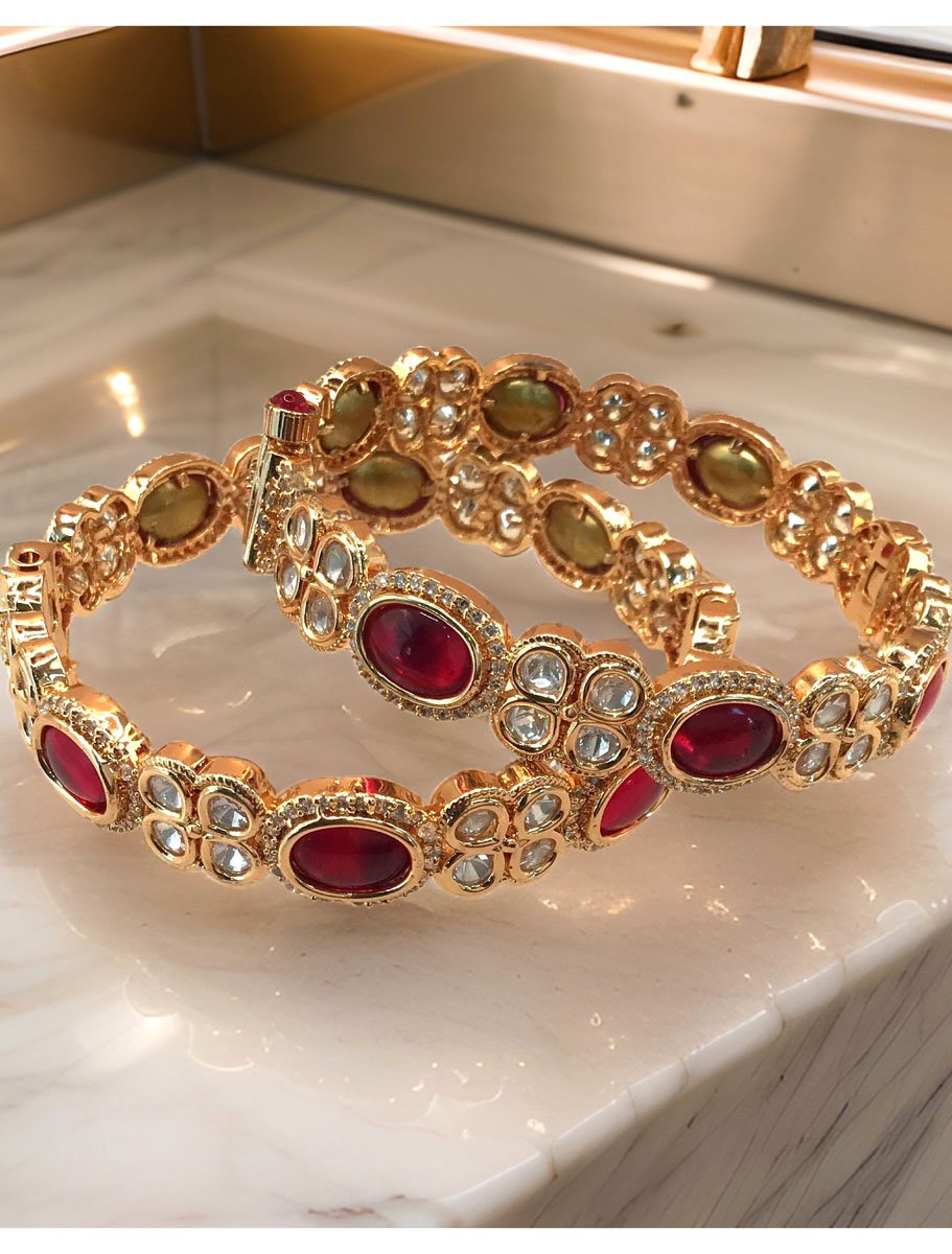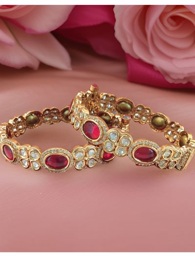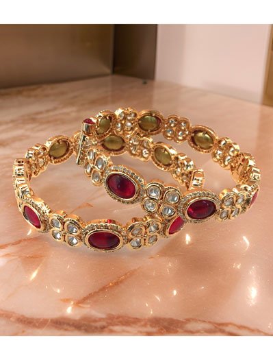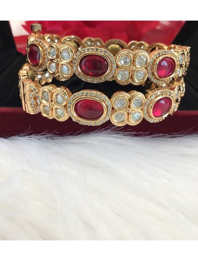 The Kundan Bangles/Bracelets featuring a 24-carat polish and Premium Quality Ruby AD stones. The detailed, smooth finishing and fine craftsmanship enhance their rich appearance of them. These women's bangles are perfect for festivals, pujas, and partywear, available in 2x4 and 2x6 sizes.