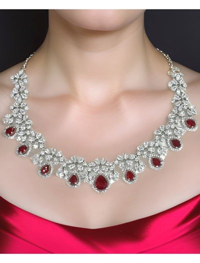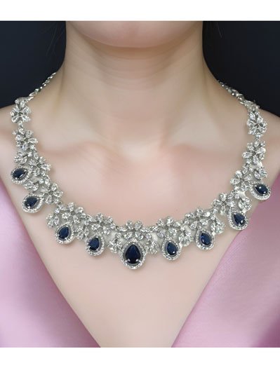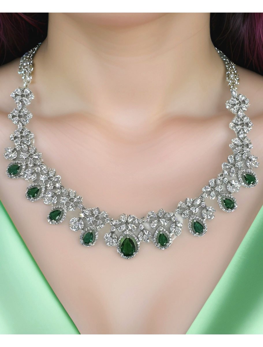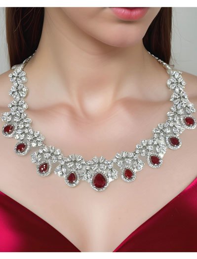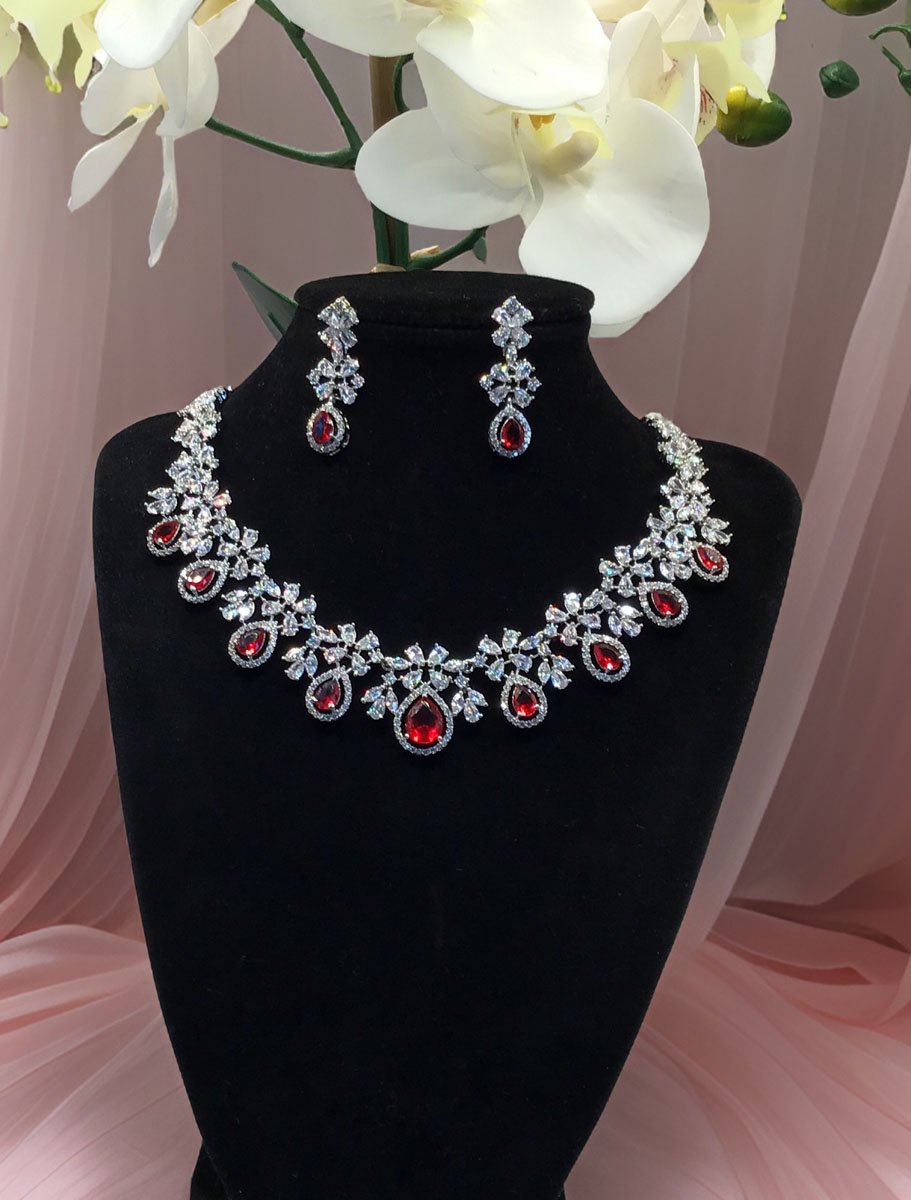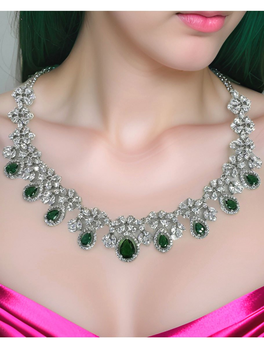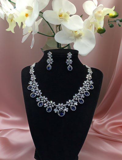 This mesmerizing jewellery set is crafted from Rhodium plated metal and adorned with dazzling AAA Quality AD Stones (available in Ruby, Saphire and Emerald), making it perfect for those special occasions when you need to look your absolute best.