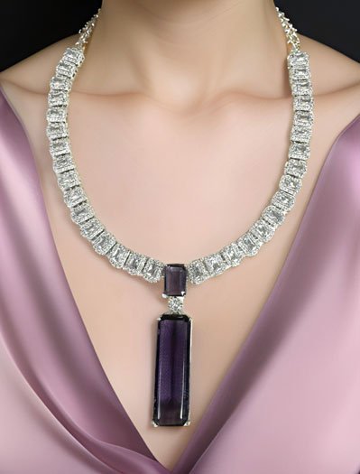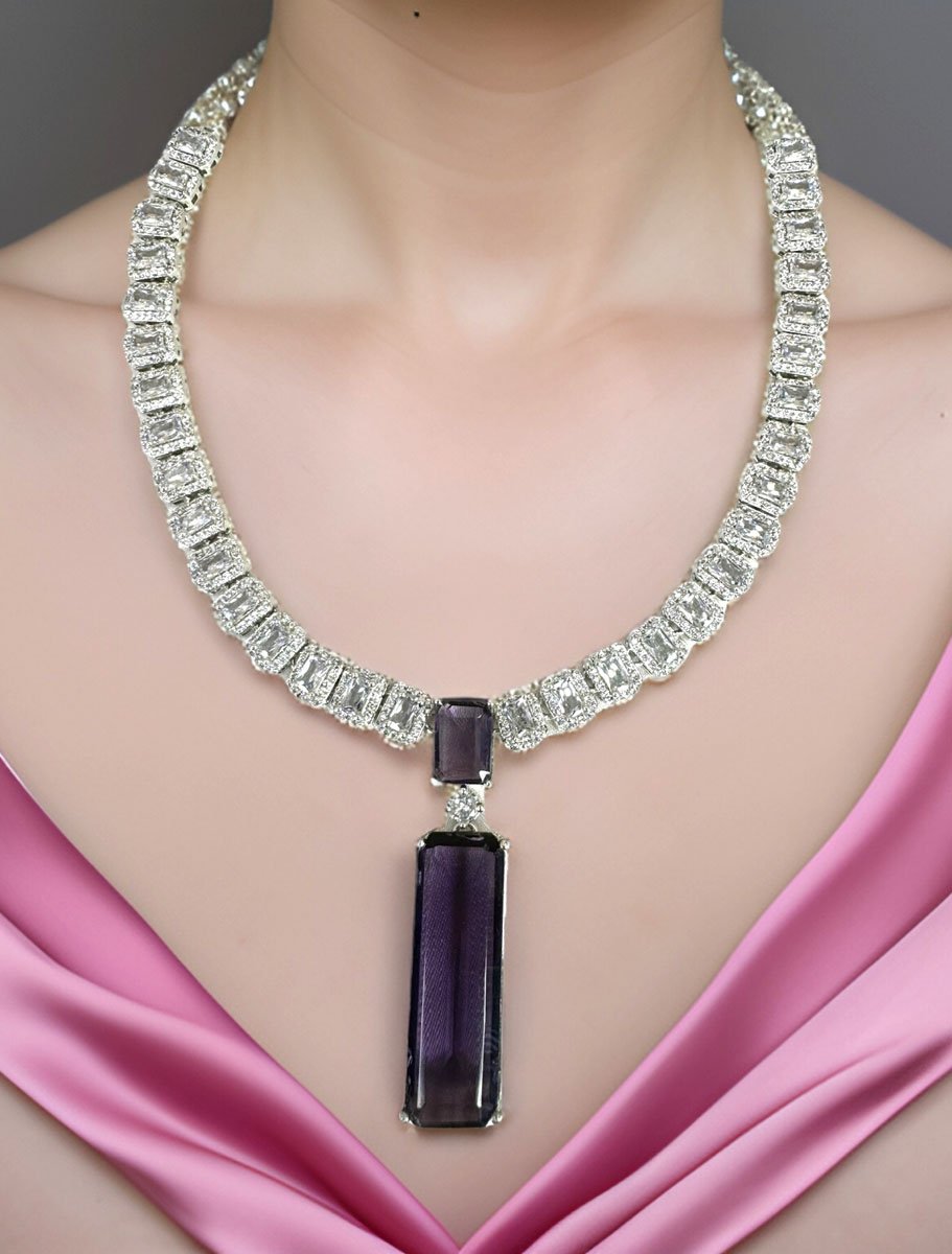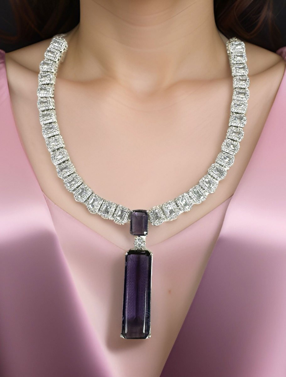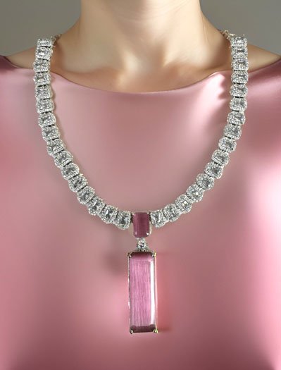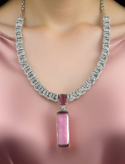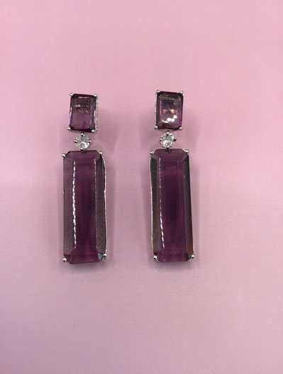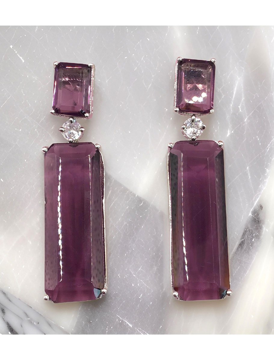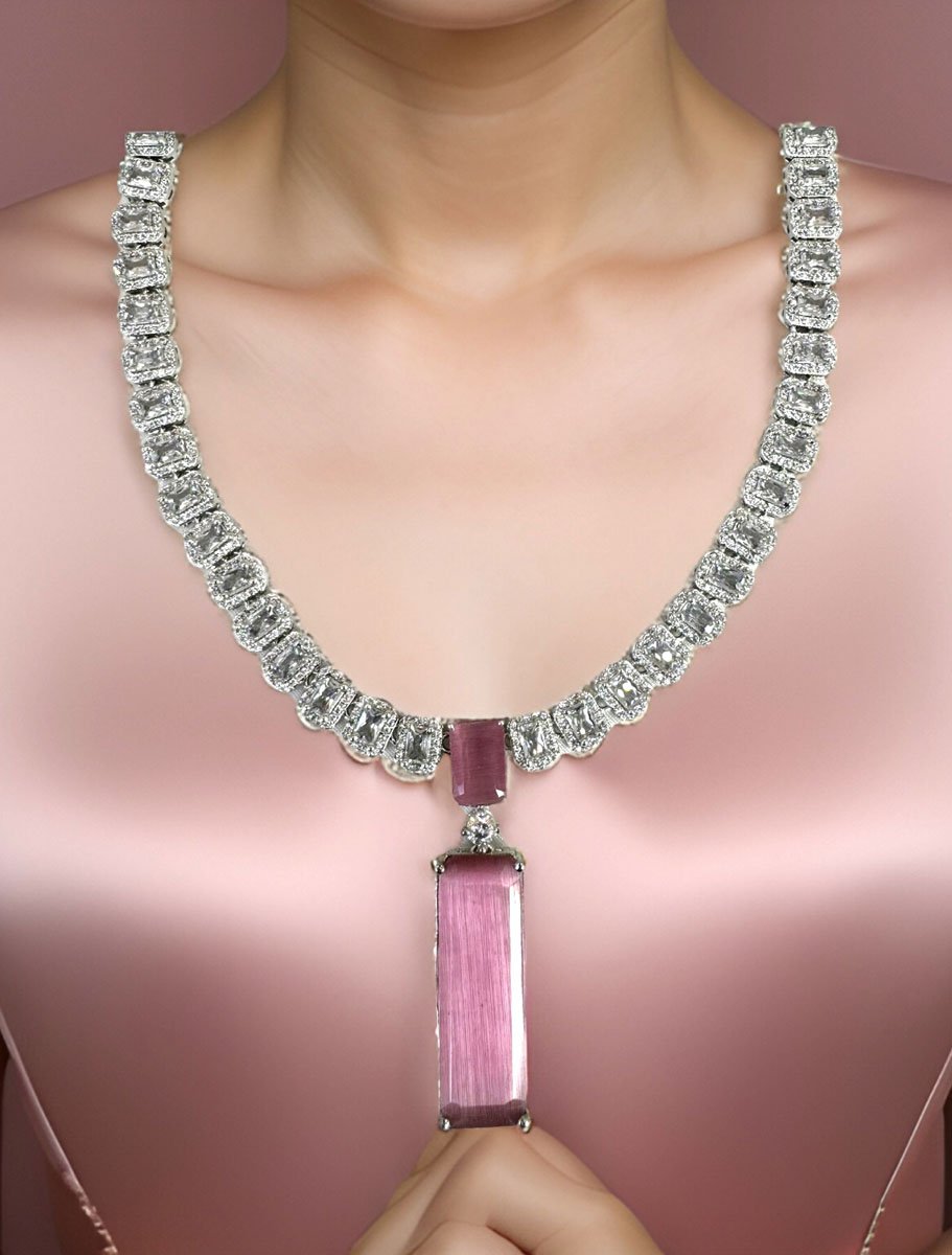 Radiant Pink CZ Stone Accented with Crystal Details Set in a Delicate White Gold Frame, Ideal for Evening Elegance, Includes a Matching Pair of Dangle Earrings. Also Available in Amethyst Purple CZ Stone.