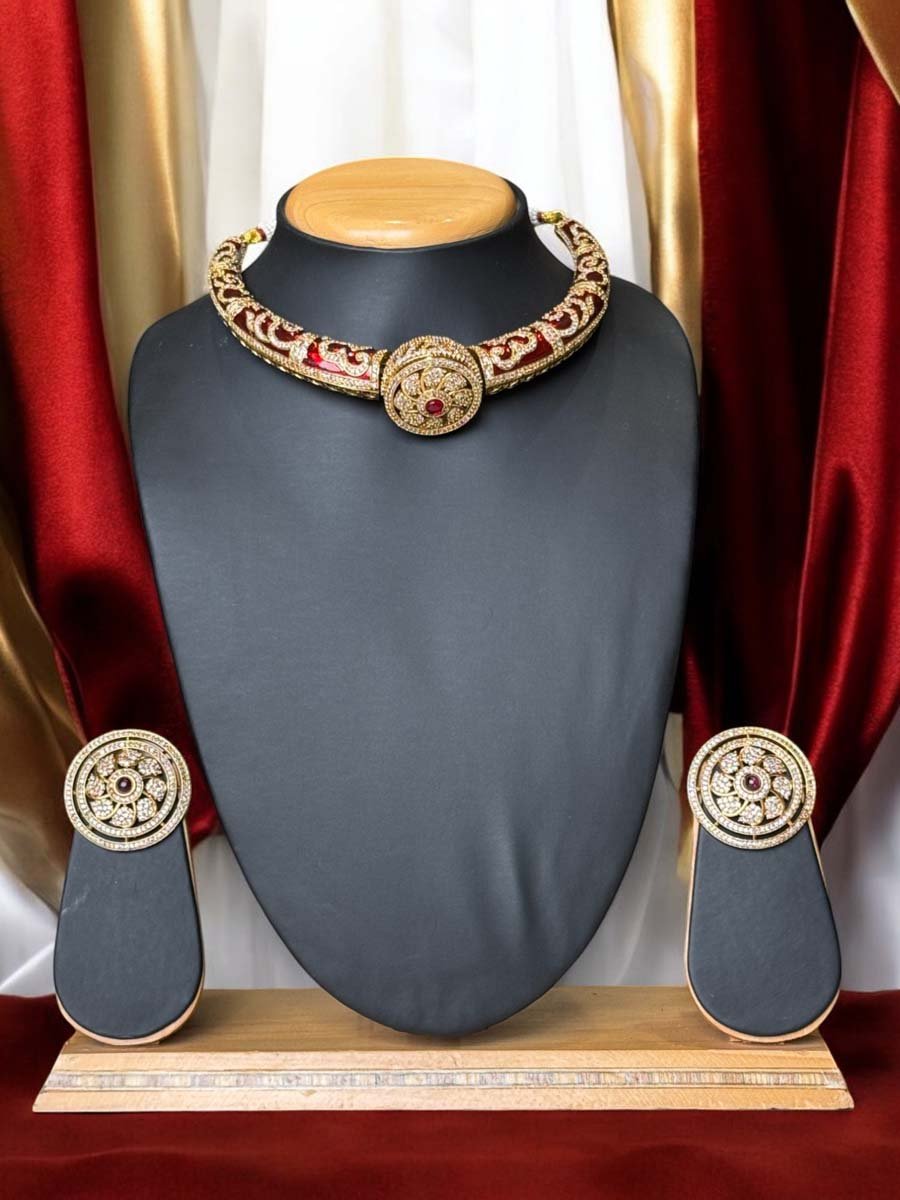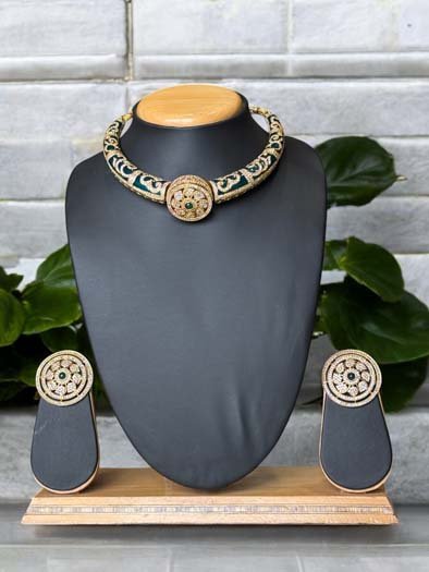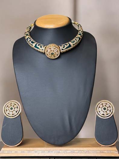 Elevate your jewelry game with this exquisite Gold Plated uncut polki Hasli set inspired by the essence of Amarpali and crafted with Moissanite polki and CZ accents. This stunning choker Necklace exudes timeless elegance, making it the perfect choice for Indian Bridal Jewelry or a glamorous Bollywood-inspired look. Channel your inner tradition with this statement piece that radiates luxury and sophistication. Upgrade your accessory collection with this show-stopping Necklace that will surely turn heads wherever you go.