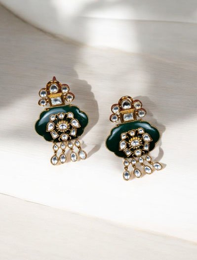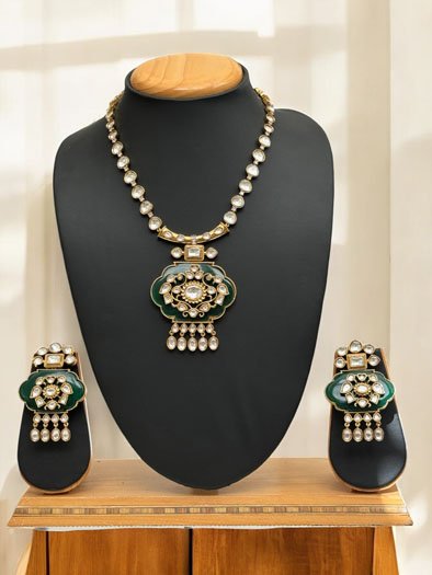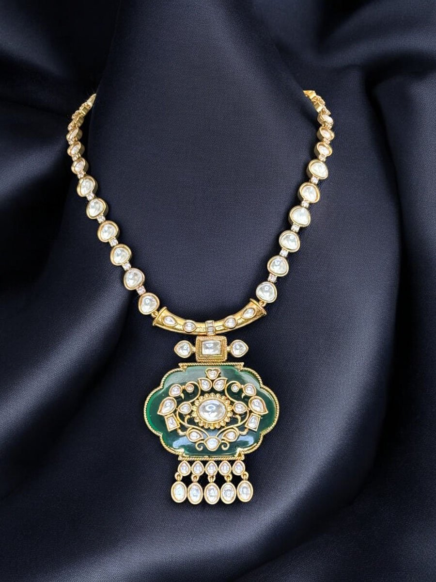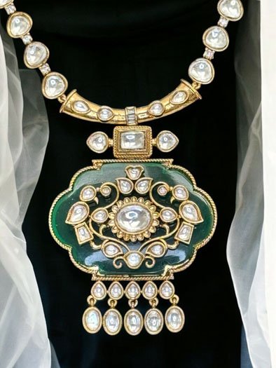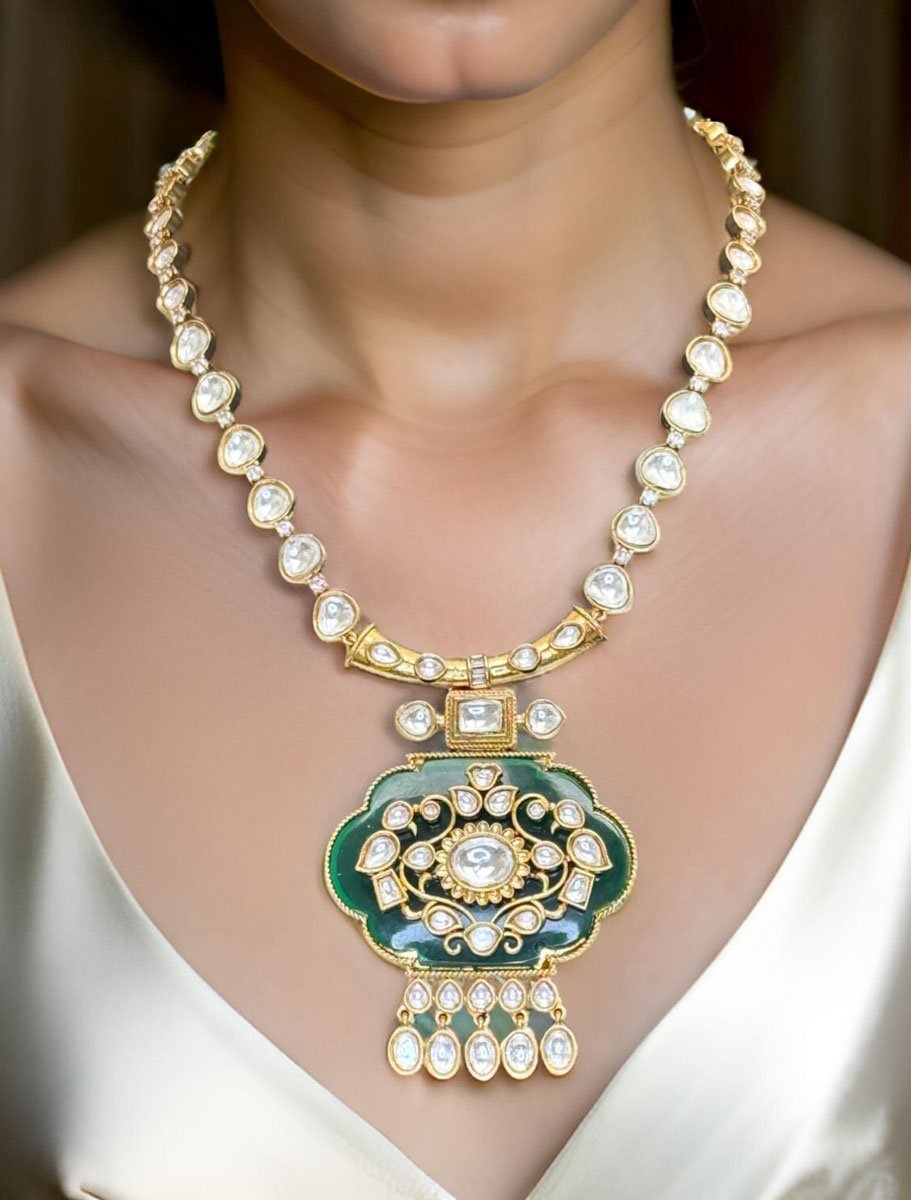 Elevate your allure with this Amrapali Inspired opulent masterpiece adorned with Moissanite Polkis & inlay of gold ornamental design on high grade carved stones. This Necklace is a stunning representation of traditional Indian craftsmanship and features intricate designs that celebrate the rich cultural heritage of India. The use of Mossanite Kundan, a traditional technique involving the setting of stones in gold foil, adds to the opulence and luxurious feel of the necklace. Accompanied by matching earrings, this jewelry set enhances its appeal, ensuring that it complements various traditional outfits, from lehengas to sarees. Its versatility allows it to be styled for both contemporary and traditional looks, making it a treasured accessory for any jewelry lover. The Amrapali Jewelry Inspired necklace is not just an ornament; it’s a statement of elegance and cultural pride. Invest in this exquisite piece of jewelry and make your special day unforgettable!