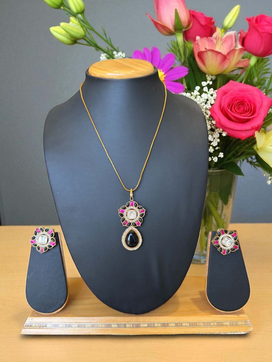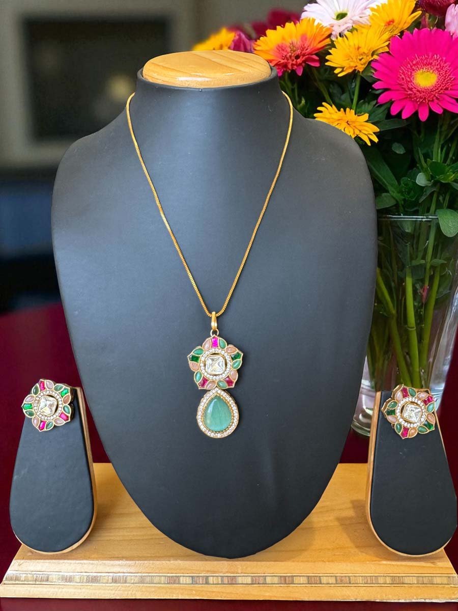 Antique Design Precious Stones Pendant set with Nano settings comes with matching studs. This amazing pendant set is versatile accessories that can complement any outfit. Their sparkling and elegant design adds a touch of glamour to both casual and formal attire, making them a perfect choice for various occasions. Whether you're dressing up for a night out or keeping it casual during the day, this pendent set effortlessly enhance your style with their timeless appeal!!