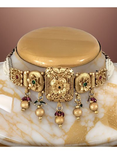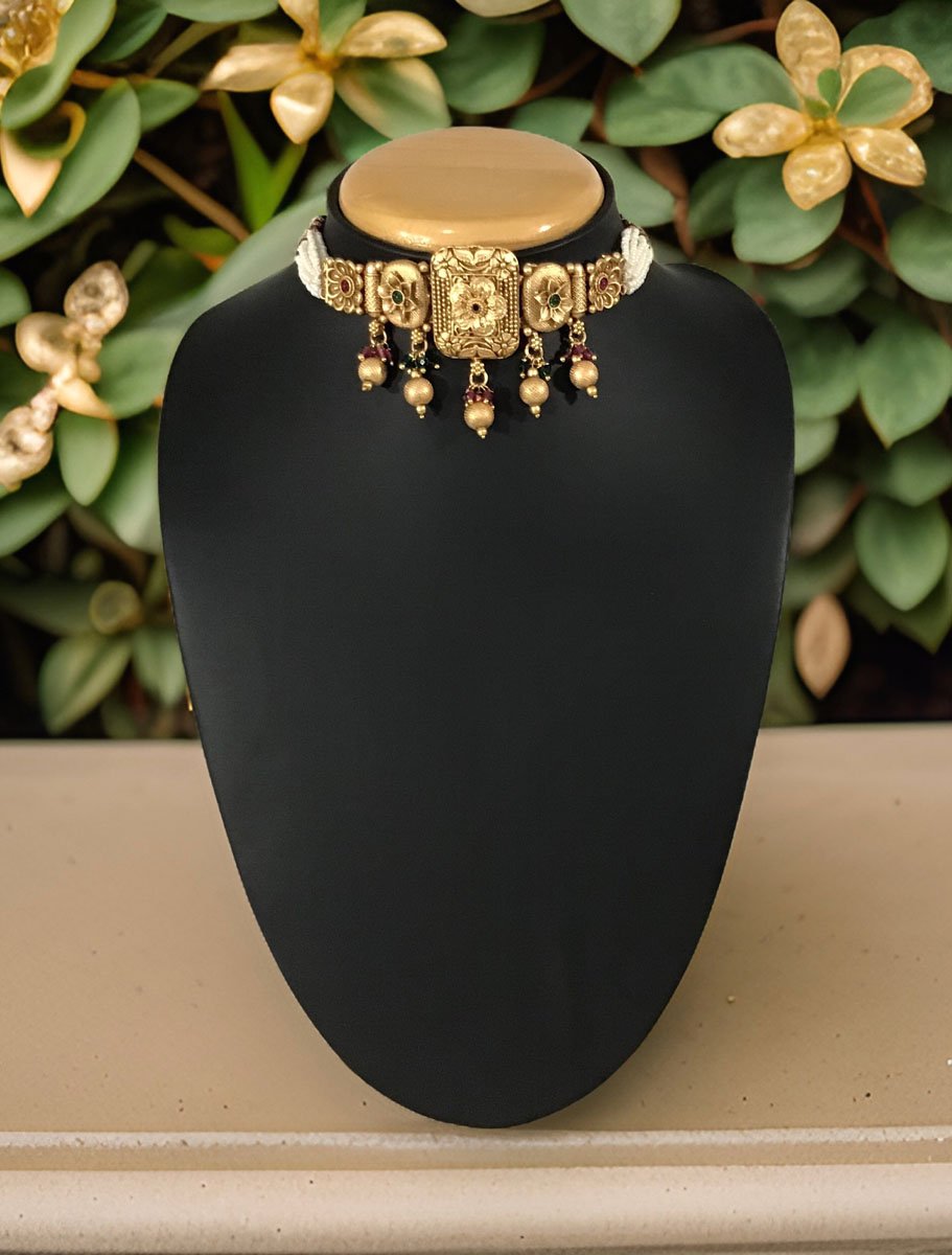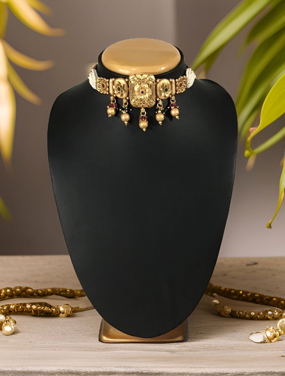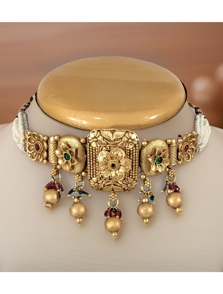 Antique Choker made in Copper with 22 karat Antique Gold plating and studded with colorful gem stones. Handcrafted To Perfection, Lightweight jewelry, Adjustable Fitting around the neck with Golden extension dori