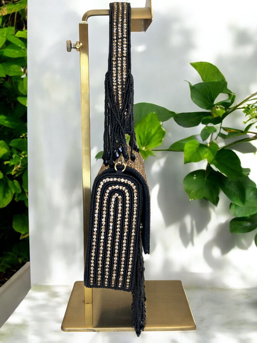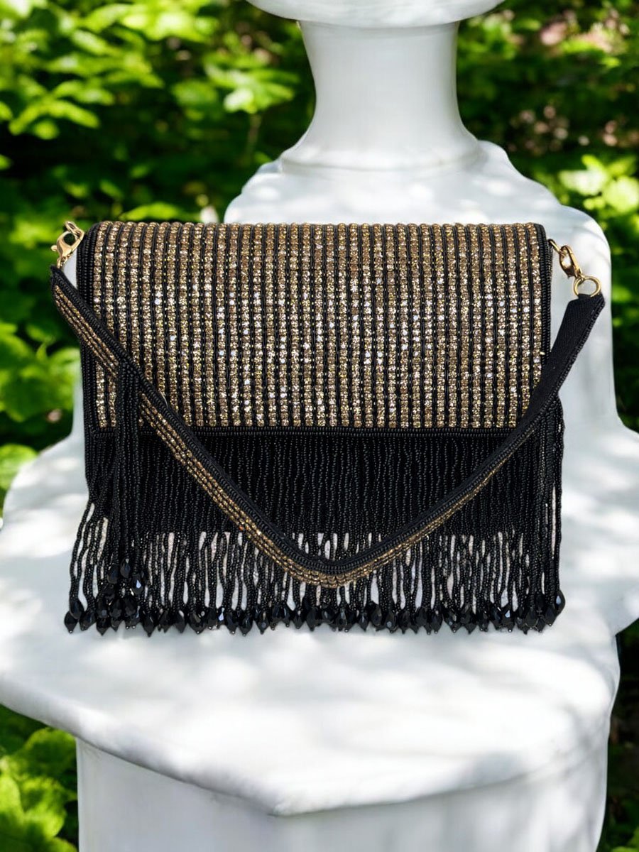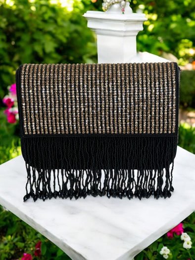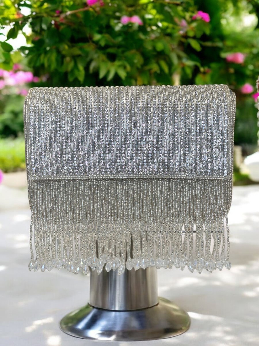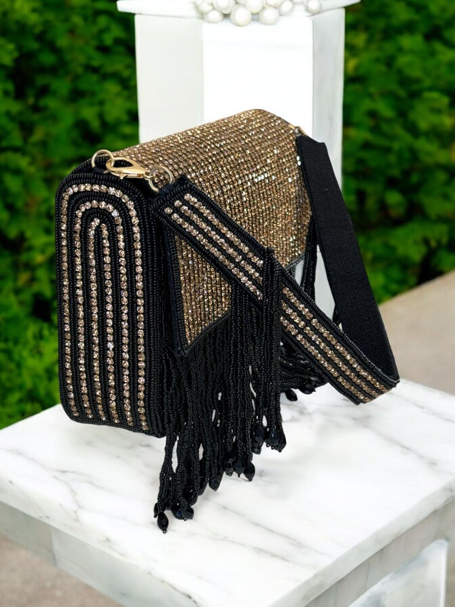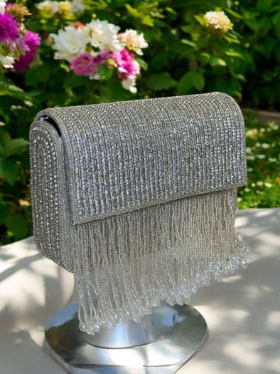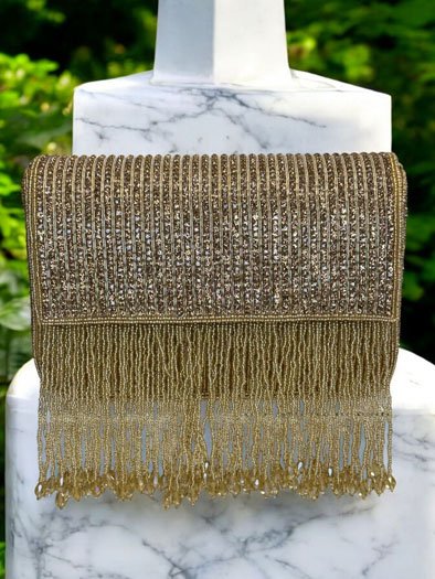 Shine bright like a diamond with Bollywood Inspired Gold Glitter Evening Clutch Bag, perfect for both the bride and her bridesmaids. This shiny purse is the ultimate accessory for any formal event, adding a touch of glamour and sophistication to your ensemble. Handcrafted with love, this embellished wedding handbag is sure to make a statement and elevate your look to new heights. Make a dazzling entrance with this stunning clutch bag that is bound to turn heads and capture hearts. Adorned with shimmering crystals and pearl floats that catch the light with every movement, this clutch adds a touch of glamour to your bridal ensemble. With a roomy interior to hold your essentials – from keys, makeup to your phone – it strikes the perfect balance between style and functionality. Make a statement on your big day with our Handmade Crystal Evening Clutch – the epitome of bridal elegance. Order yours today and carry your dreams in style!