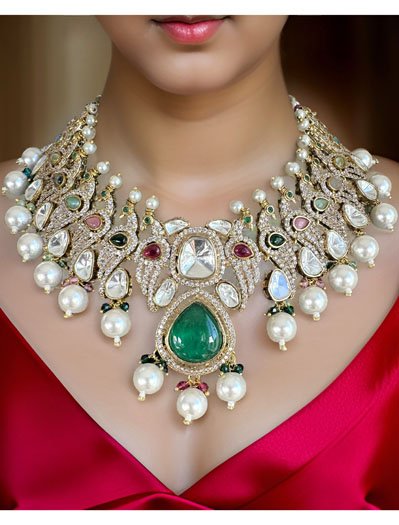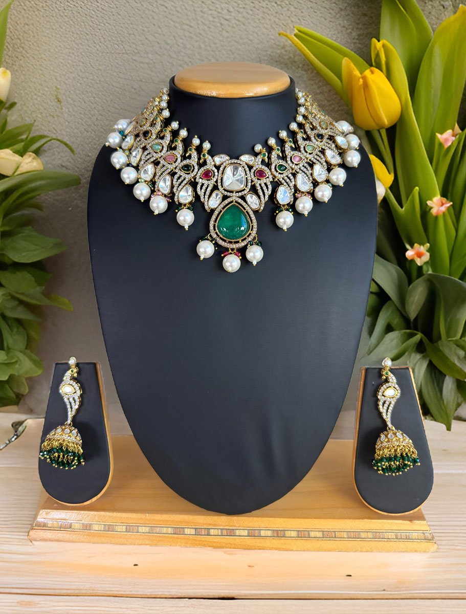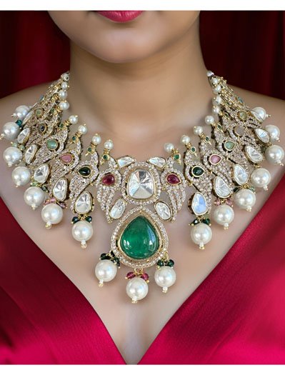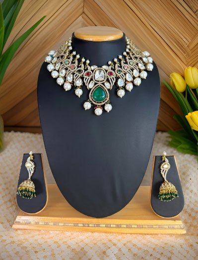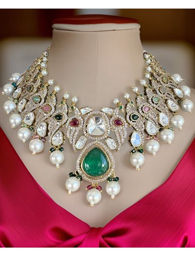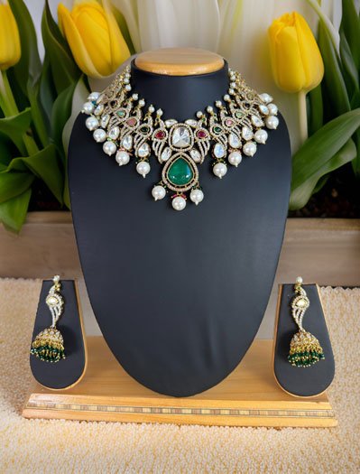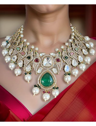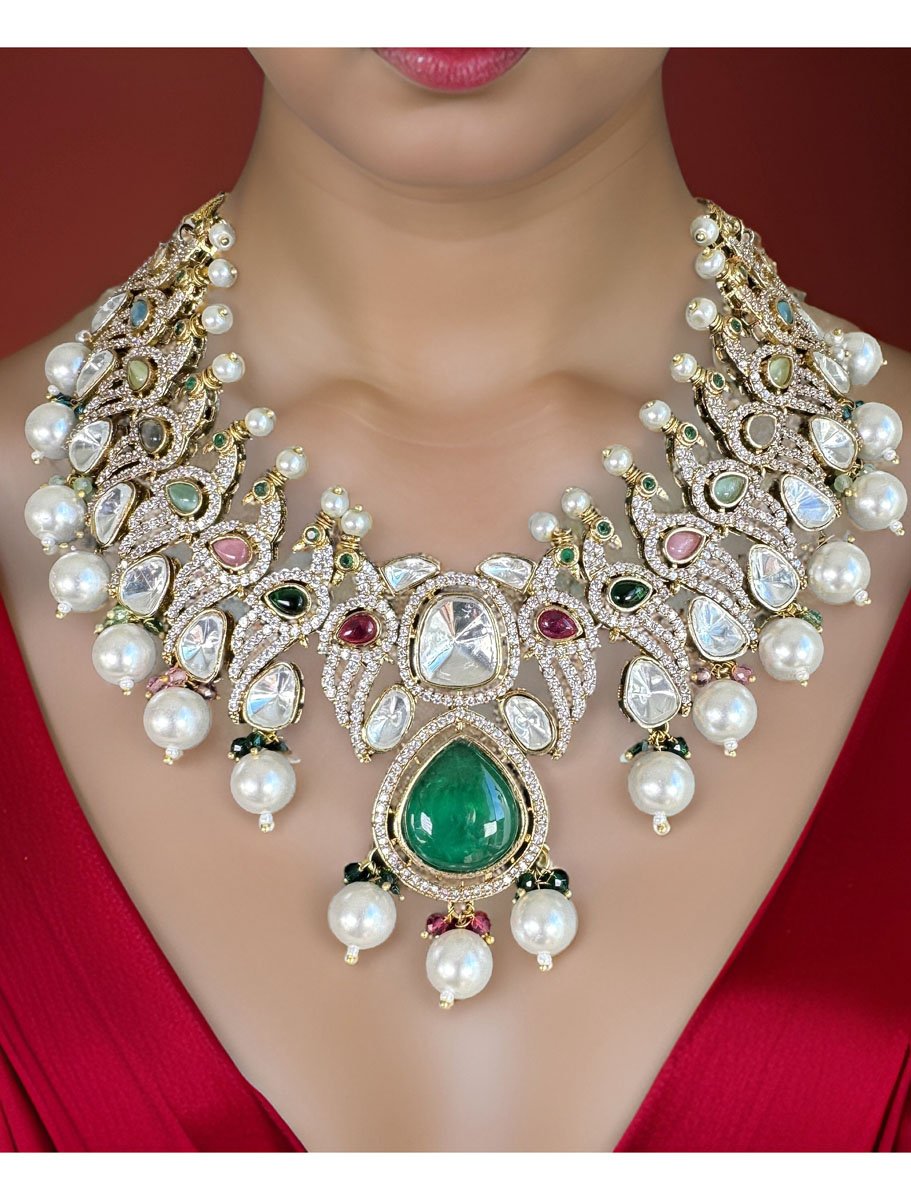 Make a dazzling impression with this exquisite Peacock Carved Kundan CZ choker set. This stunning jewelry piece is perfect for someone who want to make a statement on their special day. The necklace features a beautiful choker design adorned with AAA CZ stones Peacocks and Premium Quality Kundan and Pearl floats. The emerald-colored Gemstones in the center add a touch of elegance and sophistication to the overall look. Crafted with meticulous attention to detail, this necklace set is made to impress. It is designed to complement various styles, whether you're going for a traditional or contemporary look. The choker necklace sits comfortably on the neckline, enhancing your natural beauty and adding a glamorous touch to your ensemble.