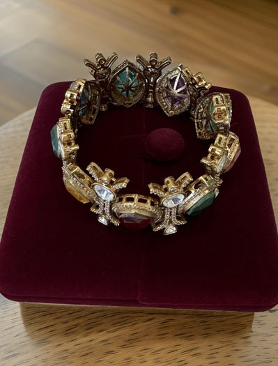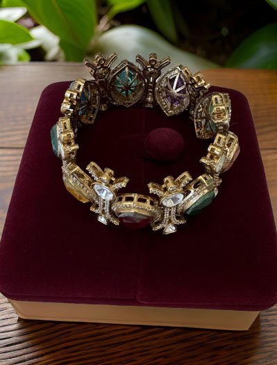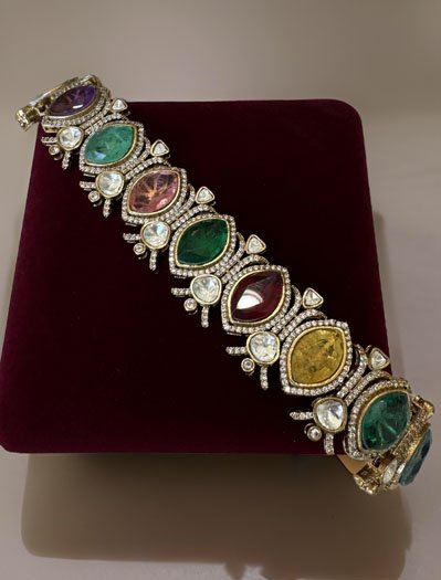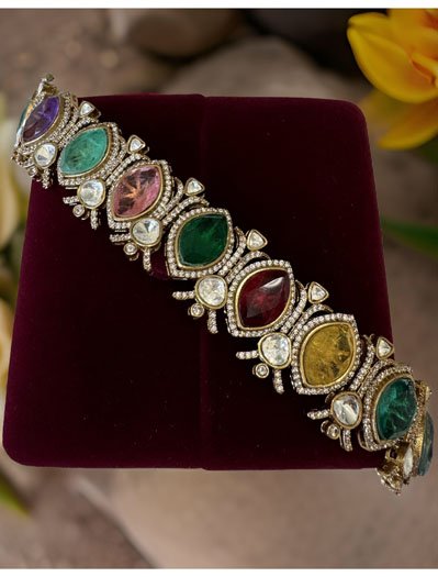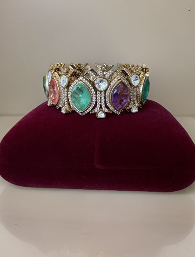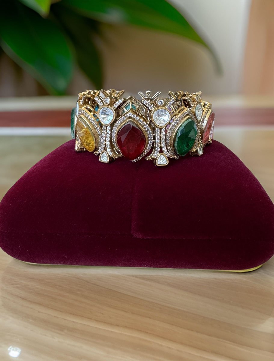 Dress up your wrists in a stylish way with this beautiful Bollywood Inspired Rainbow Premium Kundan CZ bracelet from Yashti Jewelers. The rich and ornamented design of this gives your ethnic ensemble an irresistible charm. This bracelet features high quality semi precious colorful stones surrounded by AAA quality CZ stones and Premium Kundan. Combining traditional Indian elegance with an exquisite craftsmanship, makes it a stunning and luxurious addition to any bridal ensemble. This bracelet is an ideal choice for fashion-forward women looking to infuse their jewelry selection with a dash of refinement and opulence. It is perfect for engagement, wedding, or anniversary events and will add a touch of glam to any outfit. Don't miss out on this unique and exquisite piece of jewelry that is sure to make you stand out from the crowd!!
