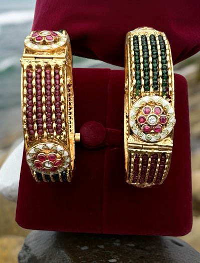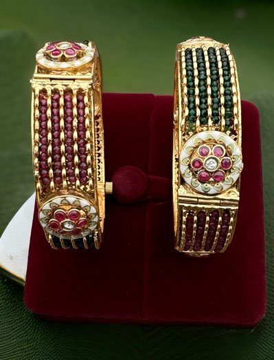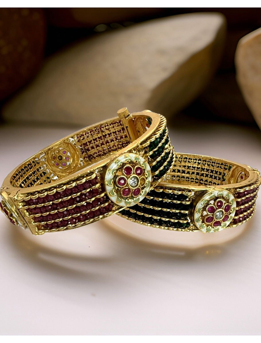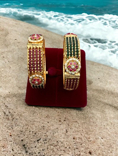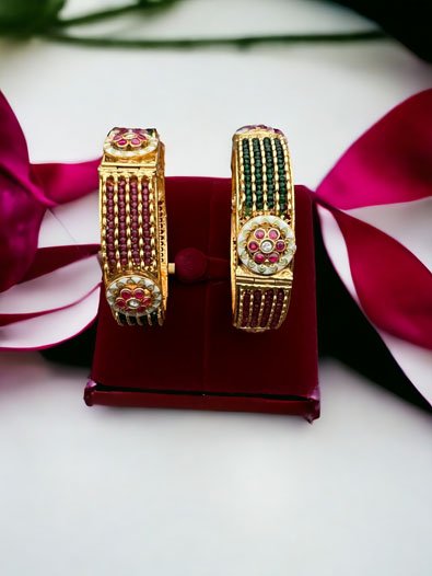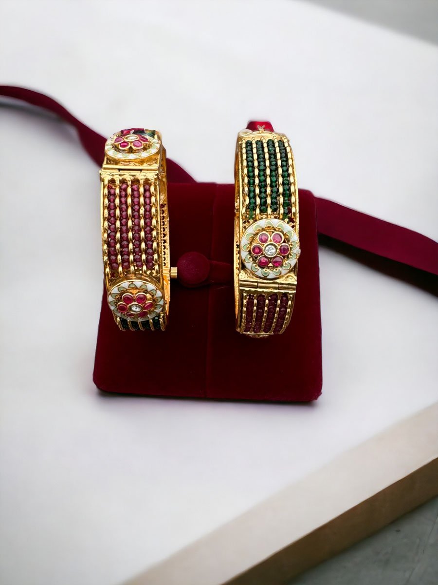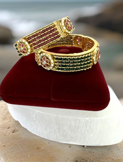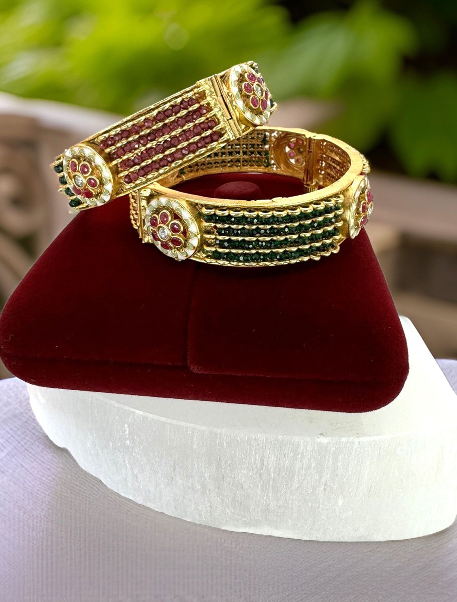 Create a beautiful memory for any occasion with Bollywood inspired designer Rajwadi Kada - handcrafted with love and creativity, perfect for any occasion such as engagement, Wedding or any bridal ceremonies or social get-together. This handcrafted kadas are made with brass alloy metal and traditional Rajasthani Ruby/Green Beads, Meenakari handwork and with fine lustrous gemstones. Pair them up with Indian traditional outfit such as Anarkalis, Lehengas or Sarees and be the “Diva” at your next special occasions, party or an event. Available in 2x4 and 2x6 size!!
