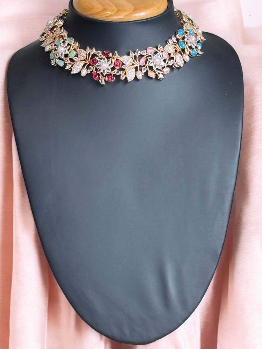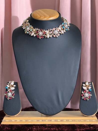 Indulge in the opulence of this beautiful AD CZ Necklace with Earrings, a true masterpiece of exquisite craftsmanship. This stunning necklace creates a mesmerizing display of elegance and sophistication. The intricate design and flawless finish of this AD Jewellery is a testament to the unparalleled skill of our artisans. The Multicolor Gemstones decorated with thin CZ stone and pearls carving adds a touch of elegance and sophistication to the overall look. Crafted with meticulous attention to detail, this necklace set is made to impress. Perfect for any occasion, this luxurious set is sure to leave a lasting impression on all who behold it. The necklace is light weight with super smooth finishing, sits comfortably on the neckline, enhancing your natural beauty and adding a glamorous touch to your ensemble.