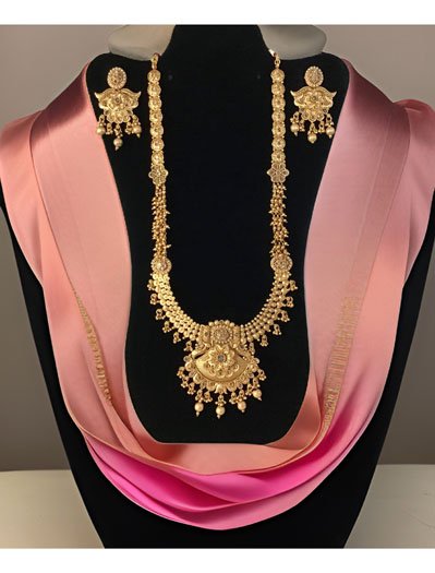 Astonishing Rajwadi Rani haar with cluster golden pearls and matt 22carat gold finish carved pendant decorated with White gem stones