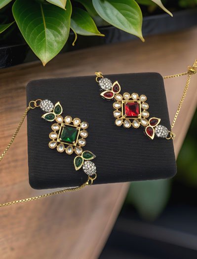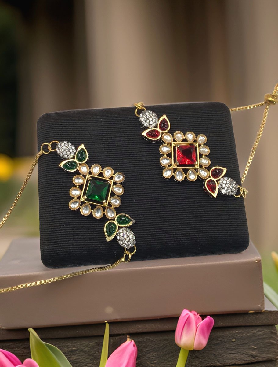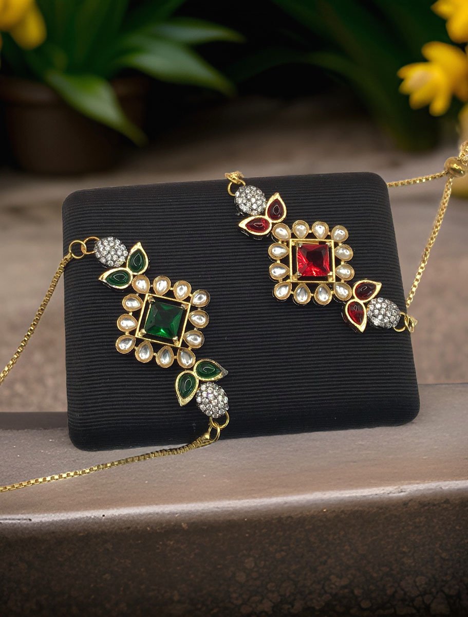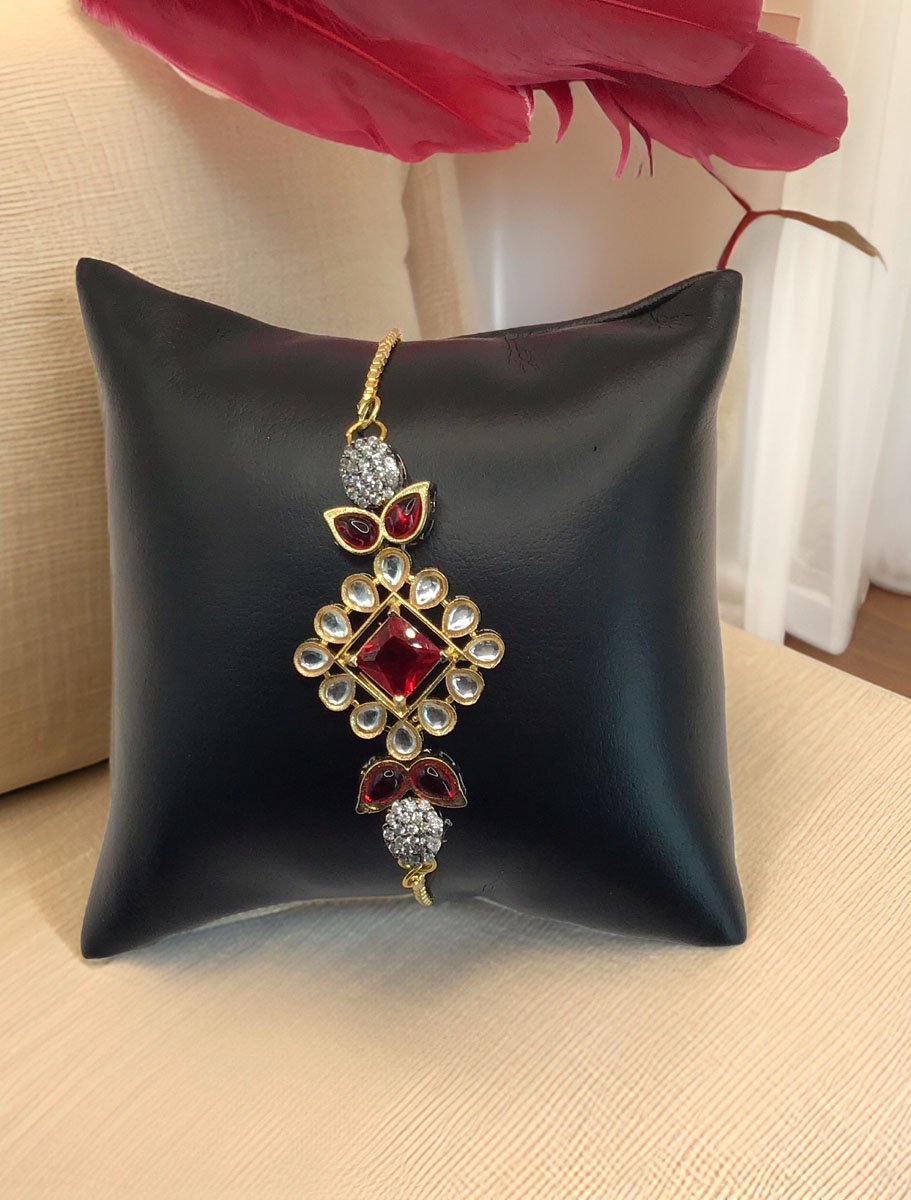 Super lightweight Kundan Rakhi Bracelet in Gold polish, made in brass and studded with Kundan and colorful CZ stones. Looks stylish on the wrist. Perfect for a party wear. Available in Ruby and Emerlald colors.