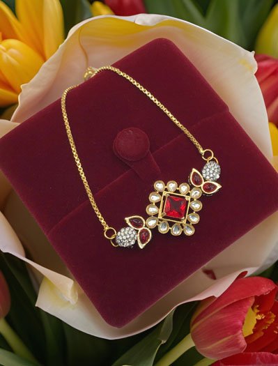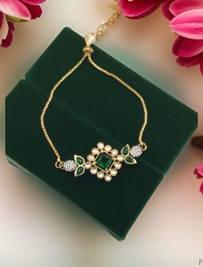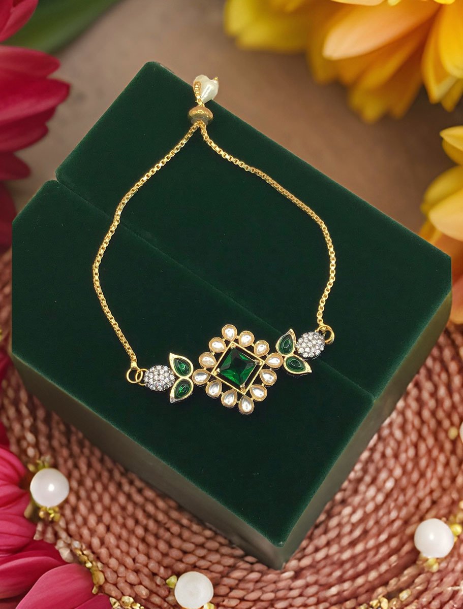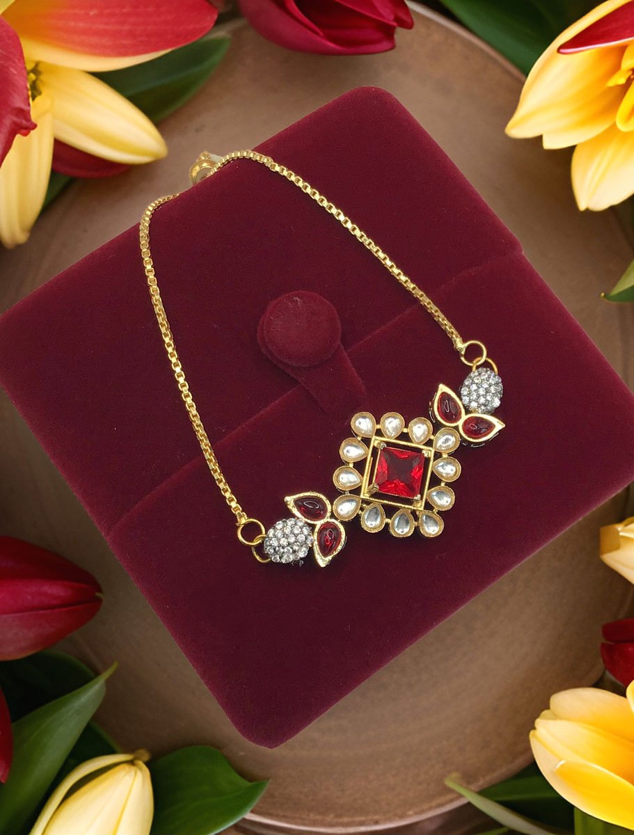 Delicate Kundan Rakhi Bracelet in Gold Polish