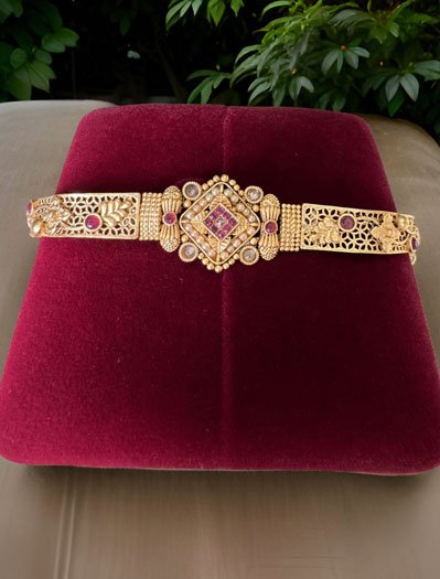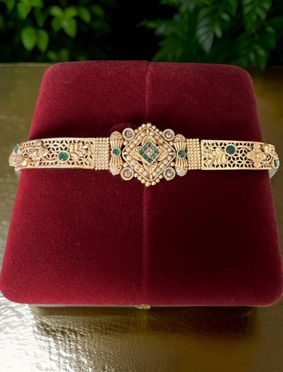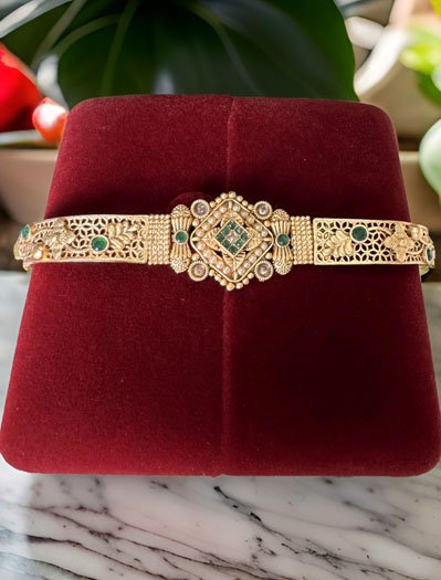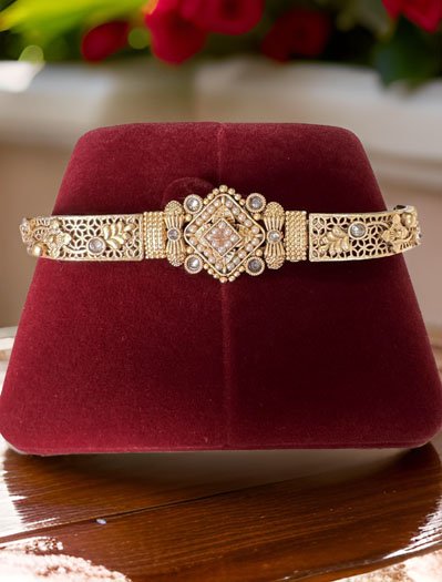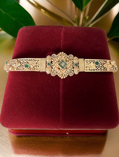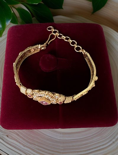 A signature piece that has a special place in every heirloom treasure box. Classic in its appeal, with a royal architecture, this bracelet is a timeless design. This gold plated bracelet creates a beautiful sheen and the white-red-green CZ stones with Pearls an appearance of princeliness. Each piece is handcrafted by an expert craftsman with love. All the raw material used in this product is of high quality. This delicate Rakhi bracelet is something that you put on and then never take it off. It pairs fantastically with formals and casuals, adding a zing to them, and just a touch of glimmer!