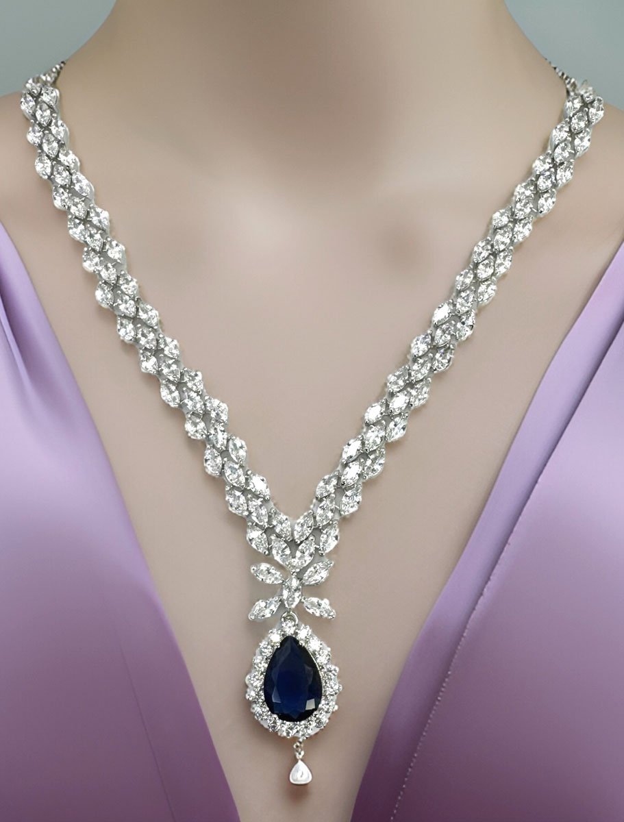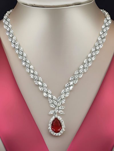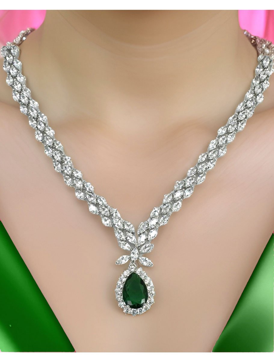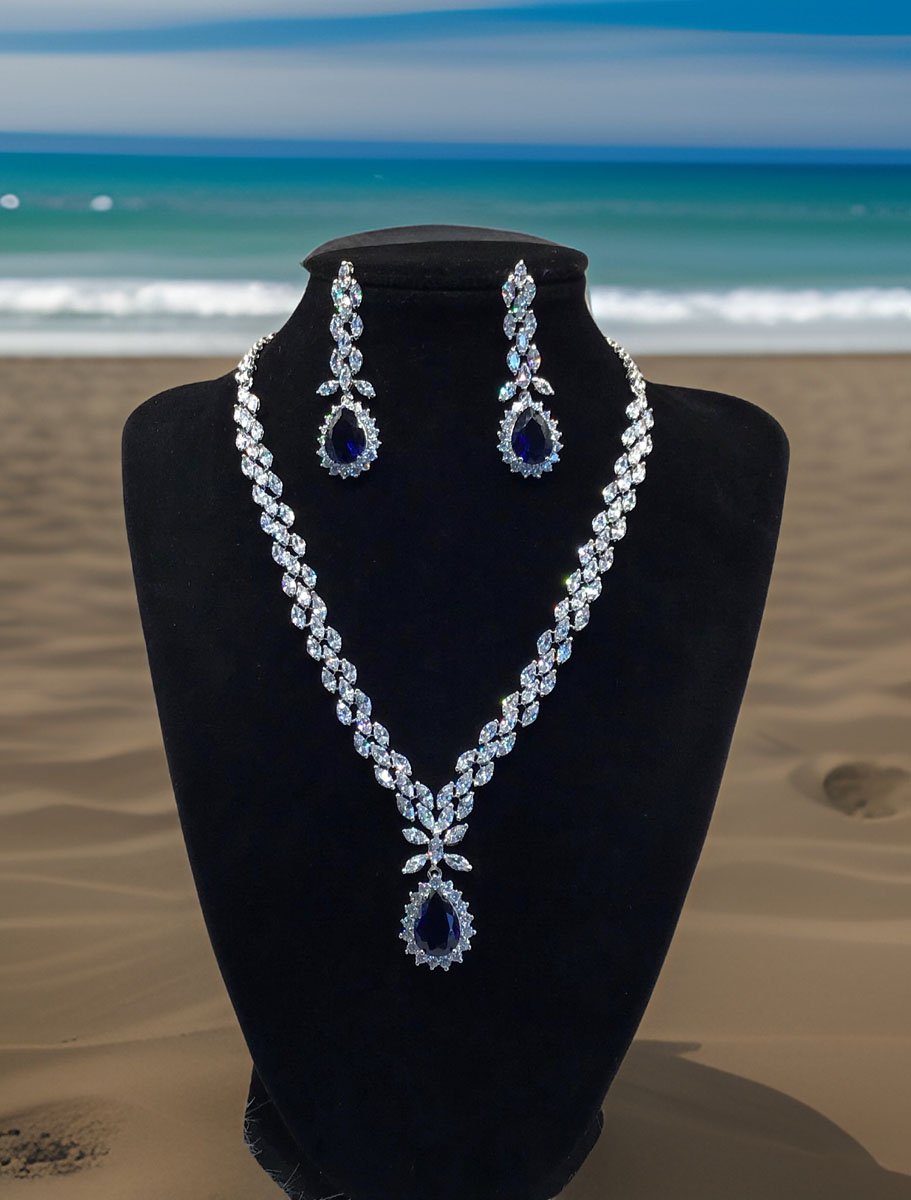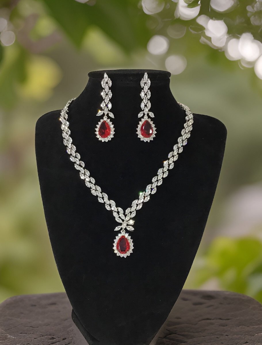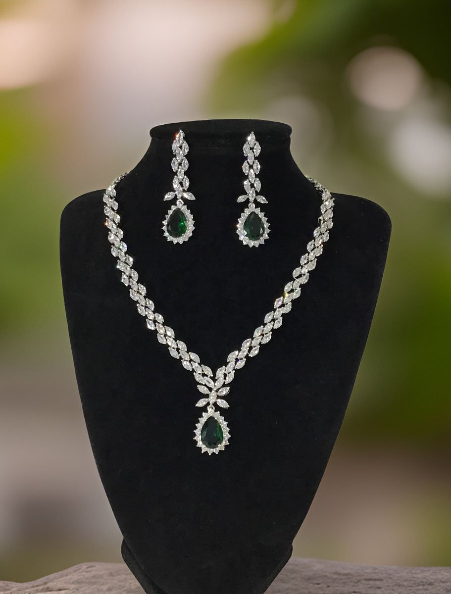 Real looking AAA cubic zirconia Emerald and diamond necklace with an adjustable length, comes with earrings. Also available in Ruby Red and Royal Blue.