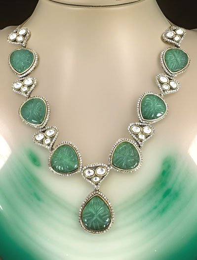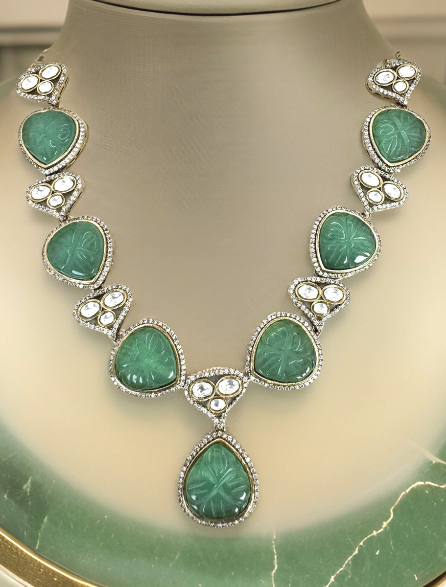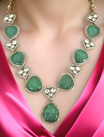 Exclusive Designer Set made with Rama Green Monalisa Stones and Kundan. Detailed carving and fine craftsmanship makes it classy. Trendy in style, feels comfortable on the neck.
