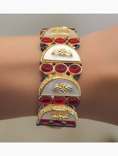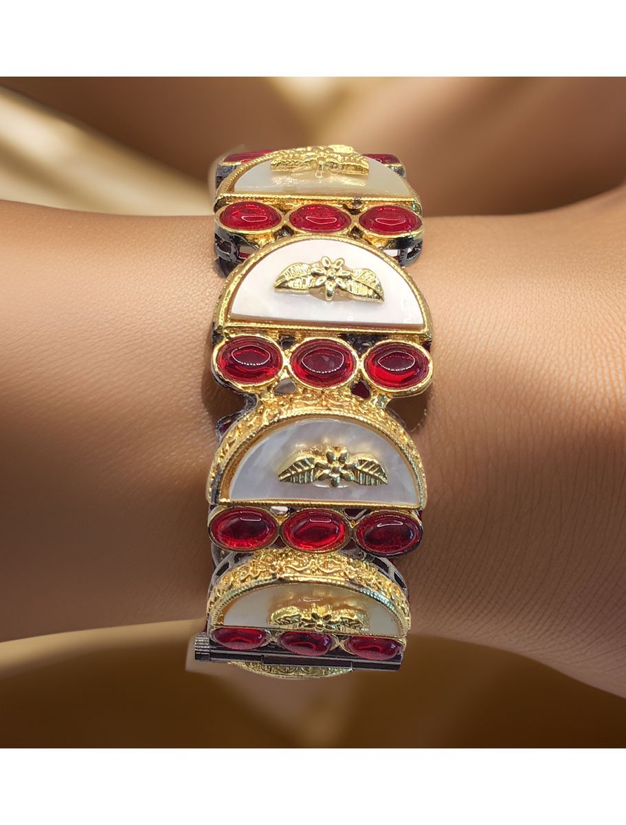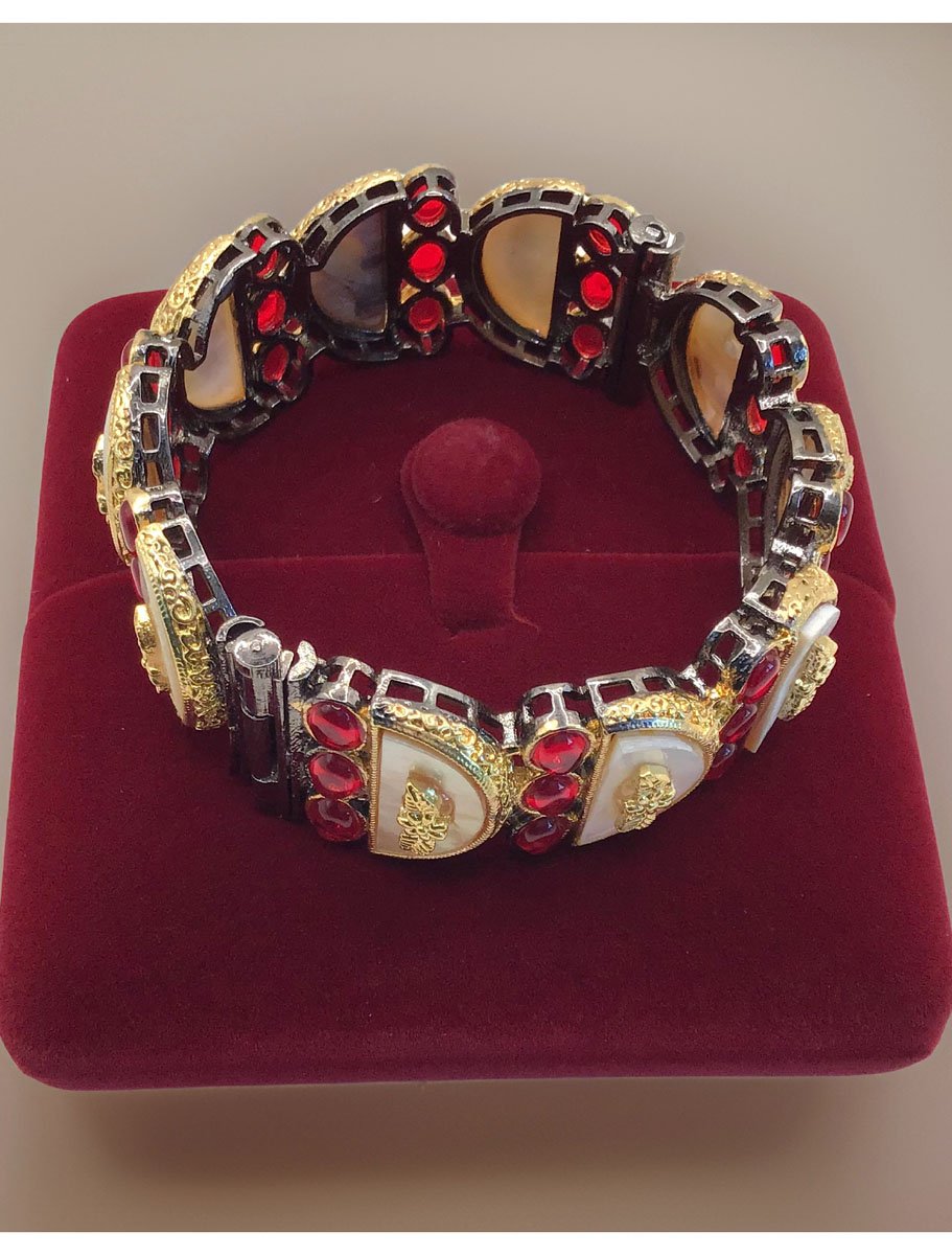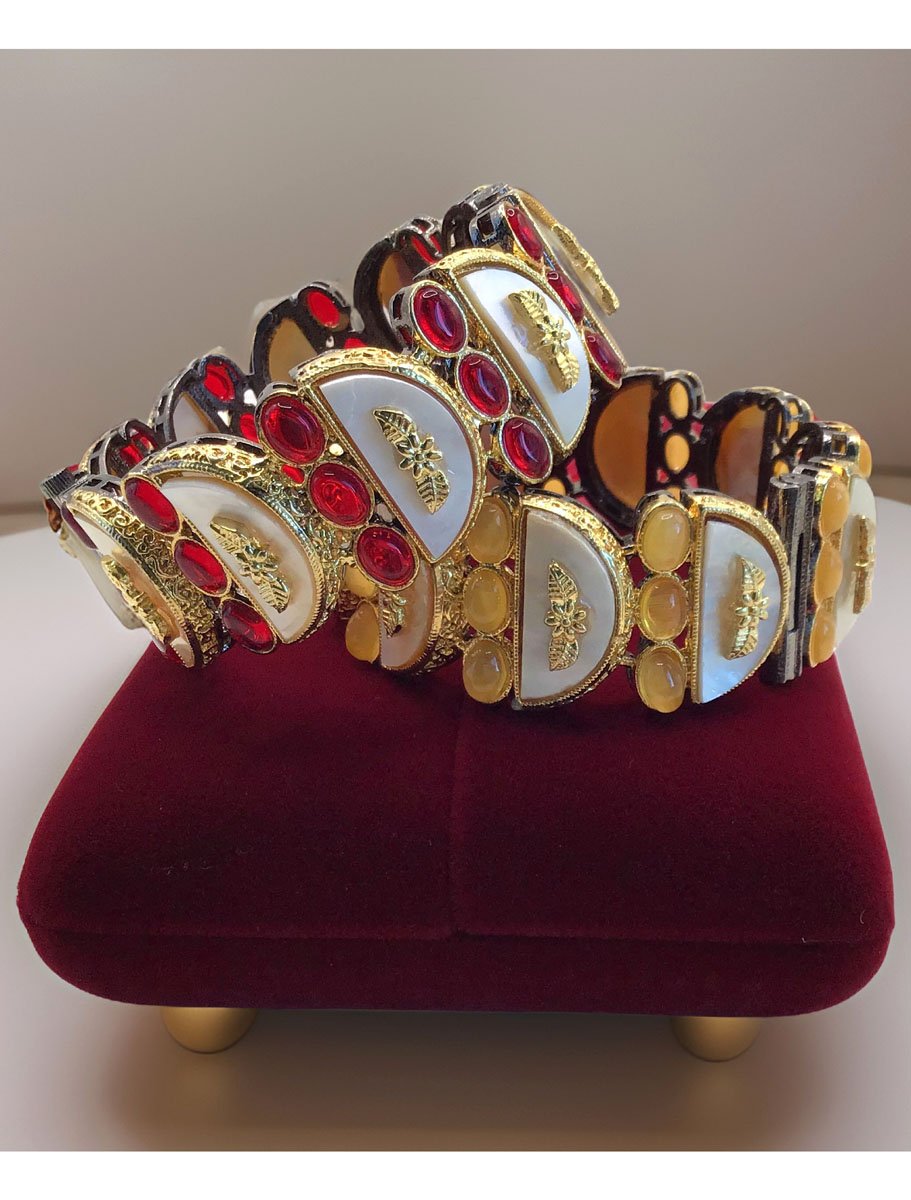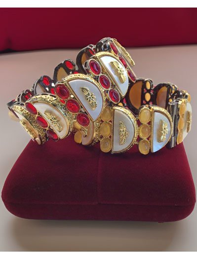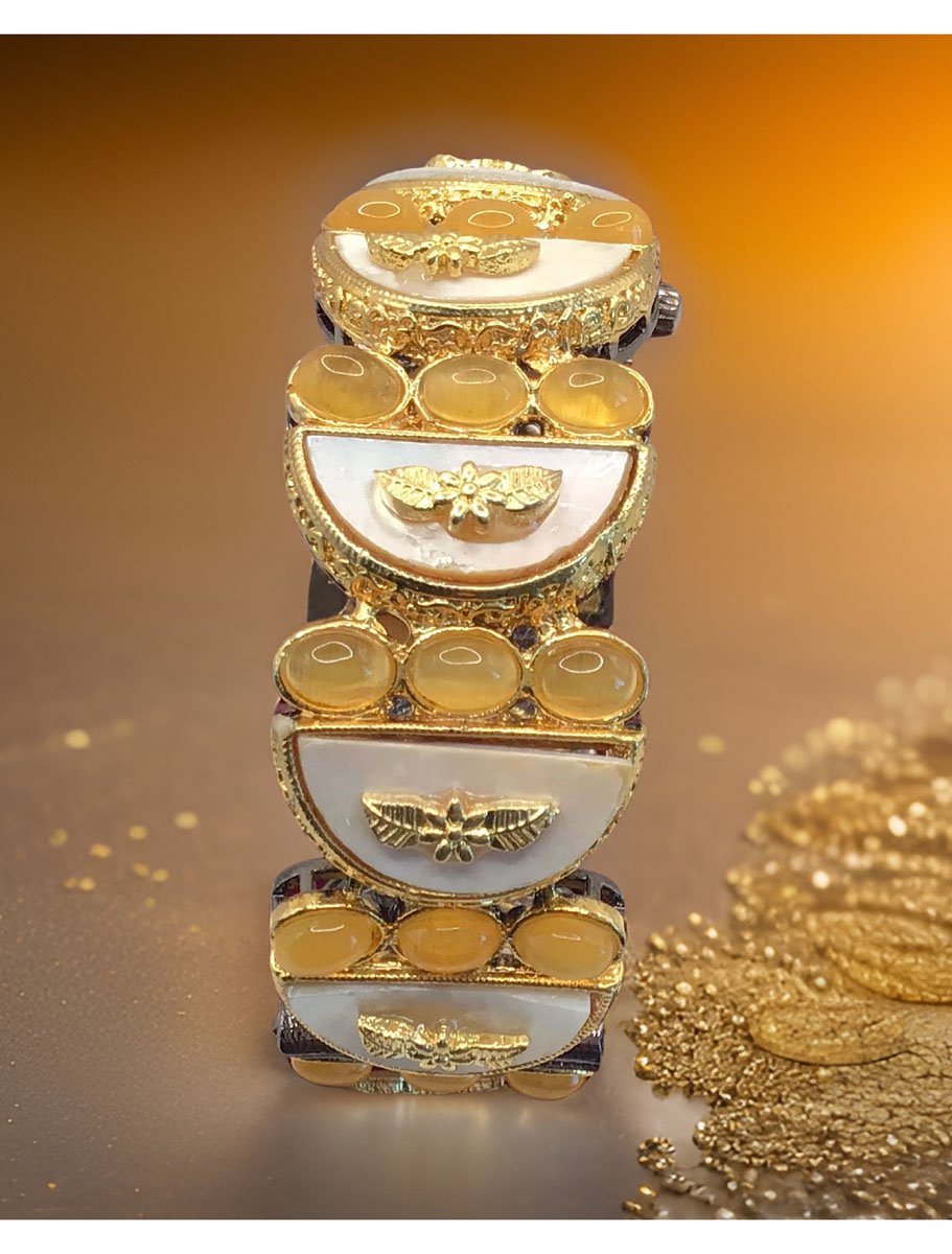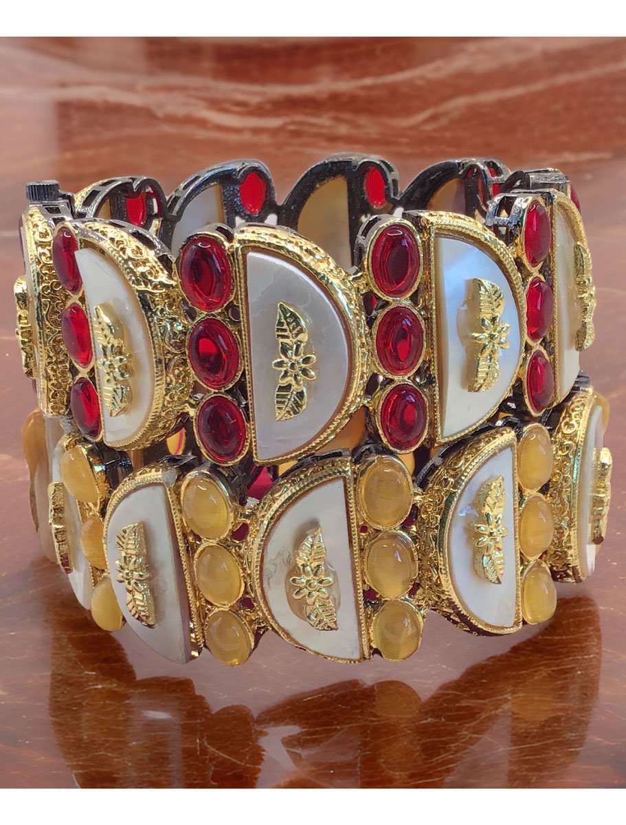 Add a touch of luxury and elegance to your look with this designer MOP kada. This kada is meticulously handcrafted by skilled artisans. Made of long lasting brass metal, Natural Mother of Pearls and good quality gemstones. This unique design is a timeless accessory, suitable for both traditional occasions and contemporary fashion statements.