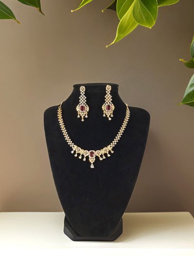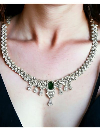 Real looking AAA cubic zirconia Emerald and american diamond necklace with an adjustable length, comes with earrings. Also available in Gold polishc Ruby Red color.