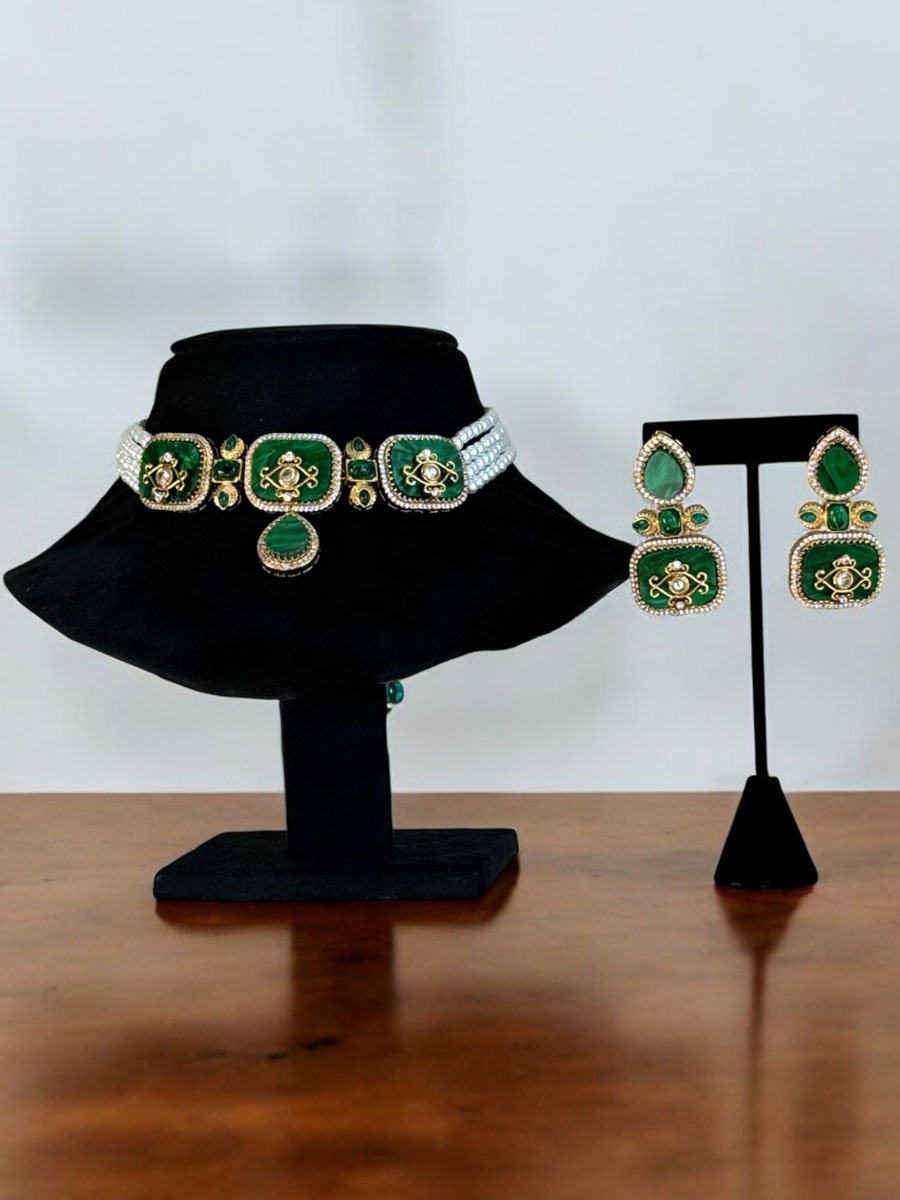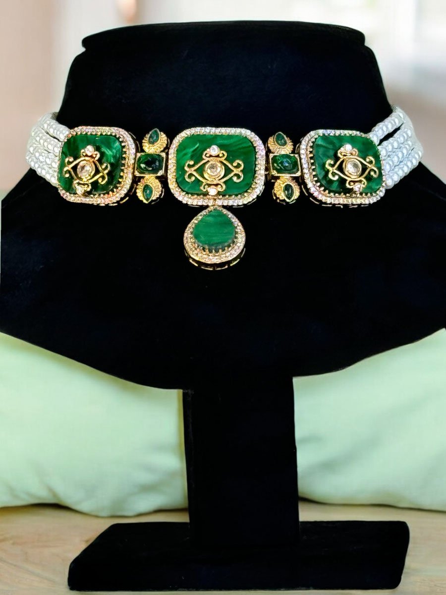 The Amrapali Jewelry Inspired Uncut Polki Kundan Choker is a stunning representation of traditional Indian craftsmanship. This exquisite piece features intricate designs that celebrate the rich cultural heritage of India. Its beautiful pendant sybolizes grace and beauty, making it a perfect statement piece for festive occasions and weddings. Accompanied by matching earrings, this jewelry set enhances its appeal, ensuring that it complements various traditional outfits, from lehengas to sarees. The Amrapali Jewelry Inspired necklace is not just an ornament; it’s a statement of elegance and cultural pride!!