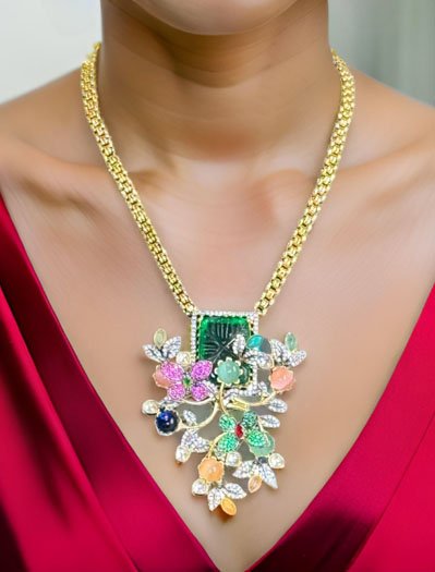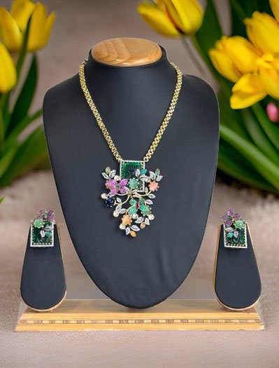 Bring a touch of royal elegance to your collection with this Sabyasachi-inspired necklace, designed with stunning multicolor gemstones pendant and a blend of Indian and Western flair. Each stone is carefully set to create a harmonious burst of color, making it a statement piece for weddings, festive events, or any occasion that calls for luxury and charm. Inspired by Sabyasachi’s iconic style, this necklace combines traditional Indian artistry with a modern, sophisticated edge that beautifully complements both Western and Indian outfits.