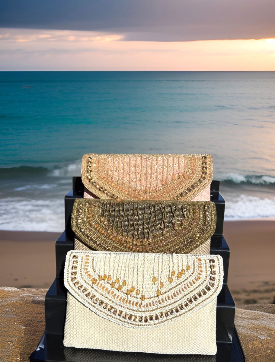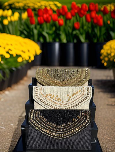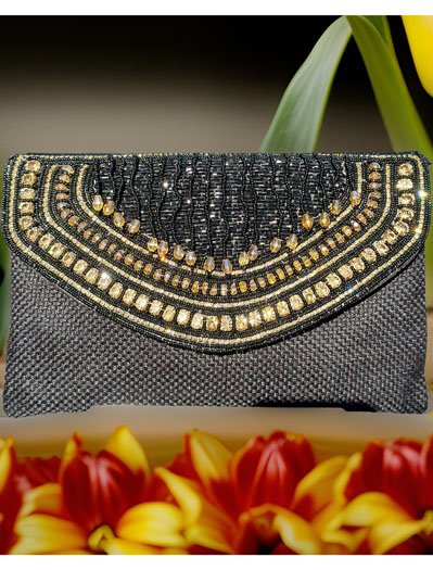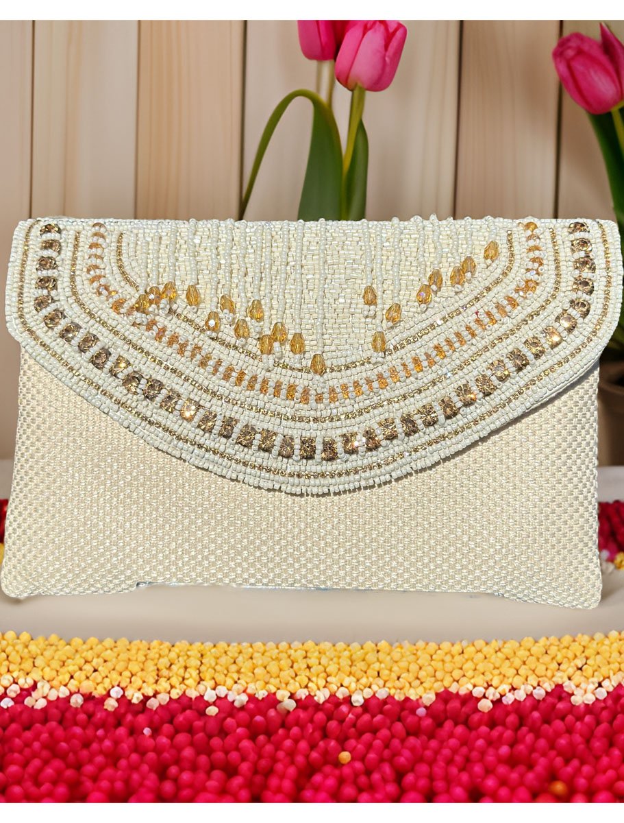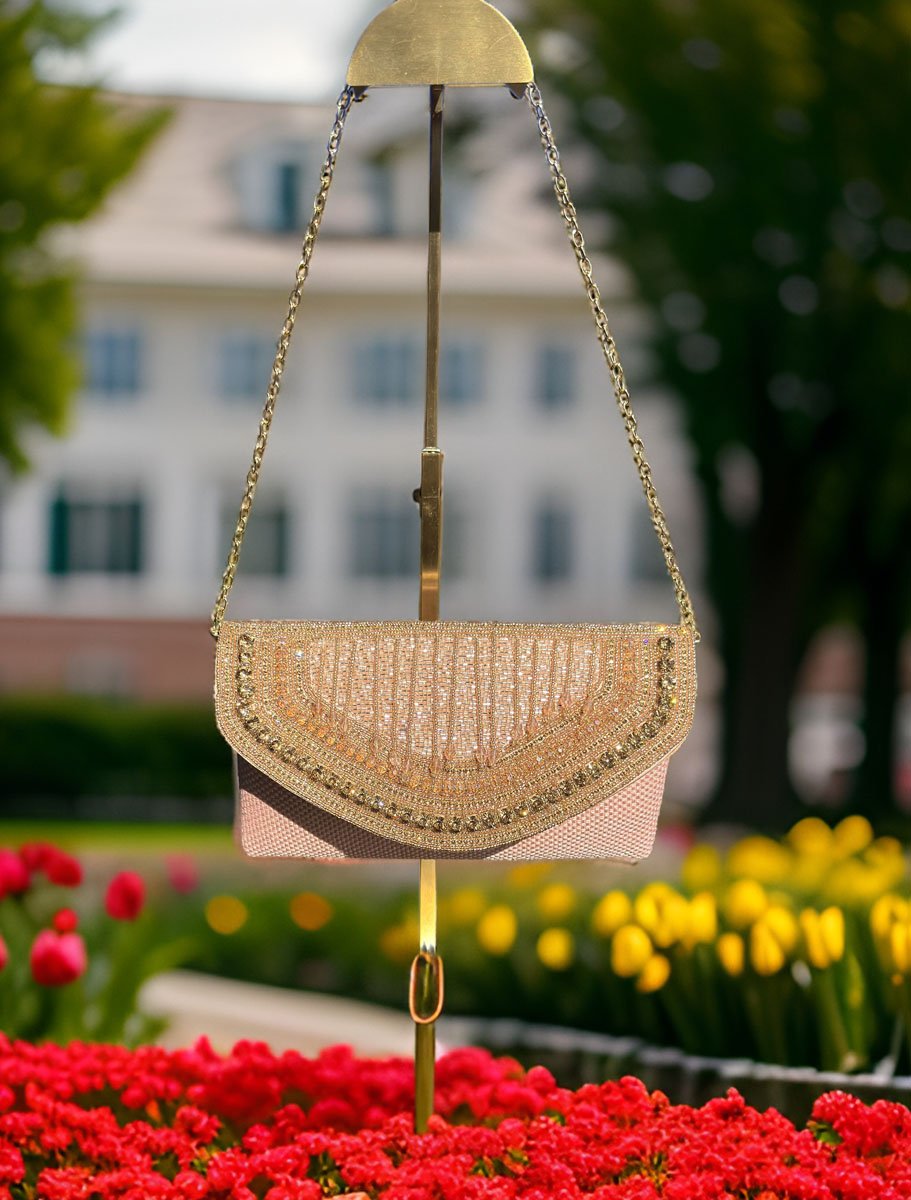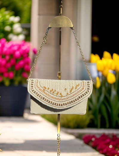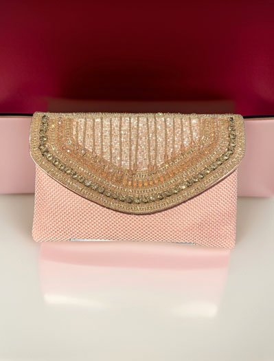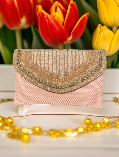 Make a lavish statement in style with this handcrafted flap over clutch bag. This clutch purse is crafted by skilled artisans with intricate patterns, adorned with rhinestones and pearls. It comes with a detachable metal chain. Its shimmering crystal beads that catch the light with every movement, this clutch adds a touch of glamour to your outfit. This is a Perfect Size to hold your essentials – from keys, makeup to your phone – it strikes the perfect balance between style and functionality. Available in Golden, Black, Beige and Pink colors.
