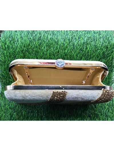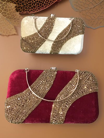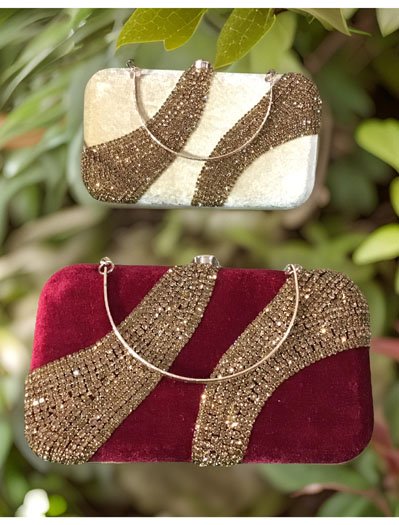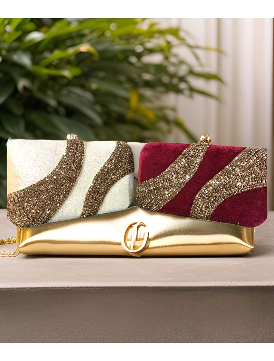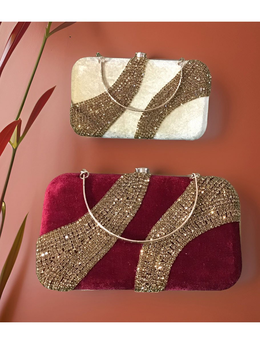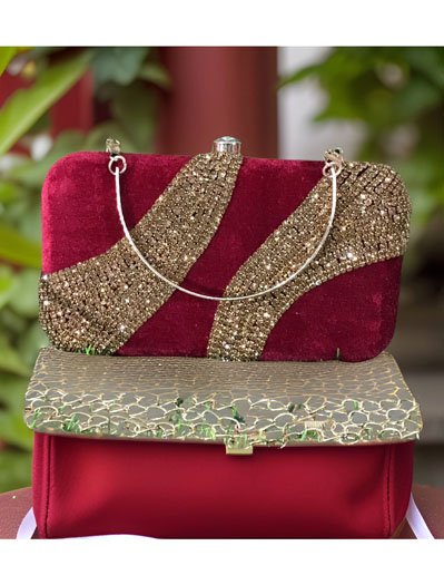 Everything about this clutch will make you feel so luxe! The velvet fabric adorned with gold embroidery and faux diamond gives this clutch a royal look. This clutch is a versatile, classy and a great additional to your wardrobe that will stick around with you for decades here on. It has metal lock closure and comes detachable metal sling and handle. This clutch is made with Embroidered velvet, gold metal sling, Metal clutch Frame. Available in Gold and Maroon color.