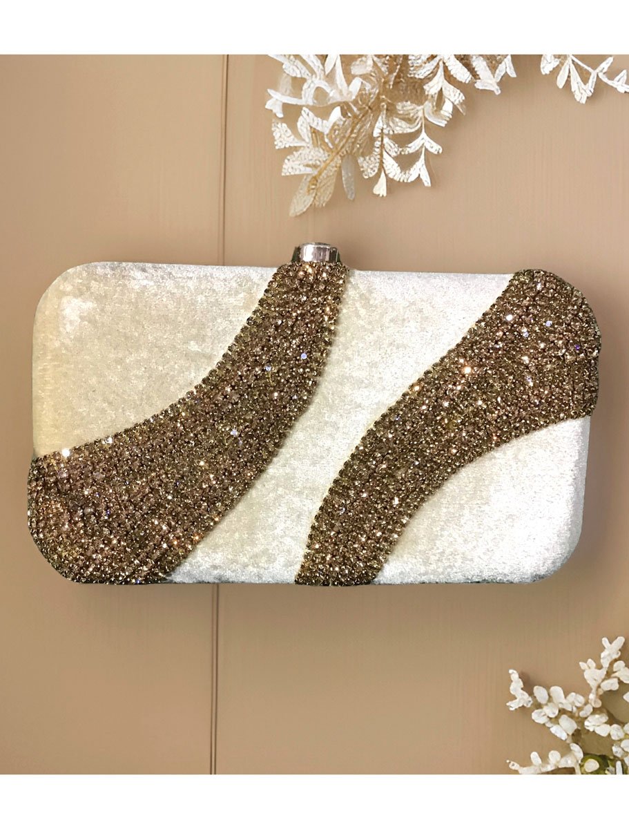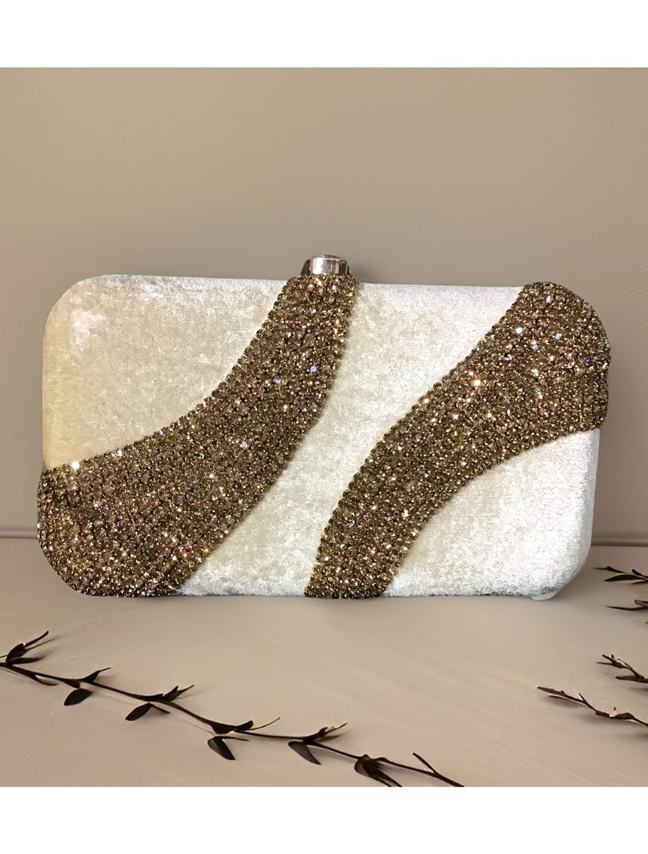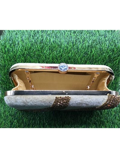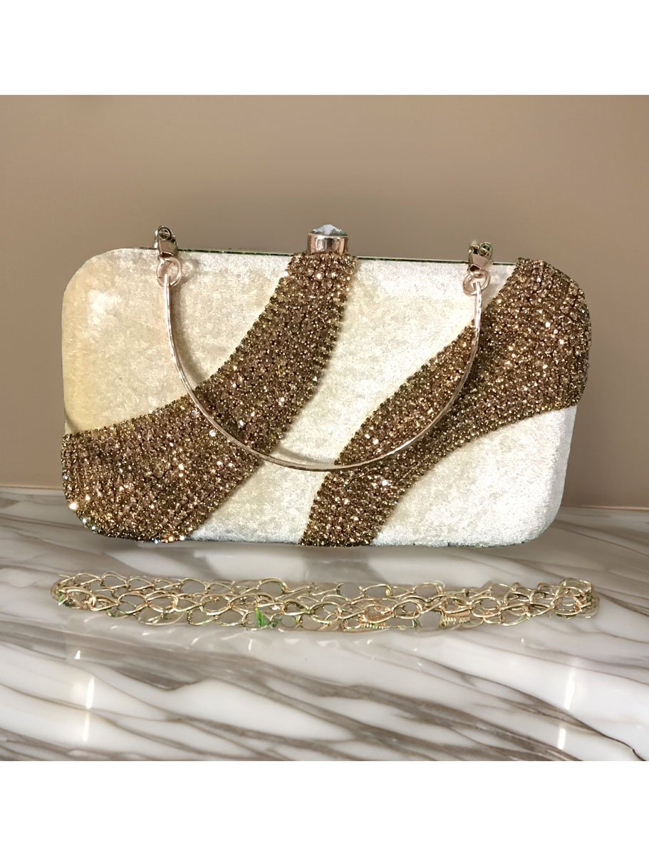 Everything about this clutch will make you feel so luxe! The velvet fabric adorned with gold embroidery and faux diamond gives this clutch a royal look. This clutch is a versatile, classy and a great additional to your wardrobe that will stick around with you for decades here on. It has metal lock closure and comes detachable metal sling and handle. This clutch is made with Embroidered velvet, gold metal sling, Metal clutch Frame. Available in Gold and Maroon color.