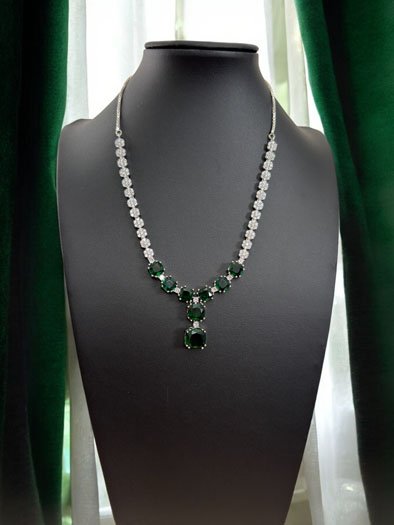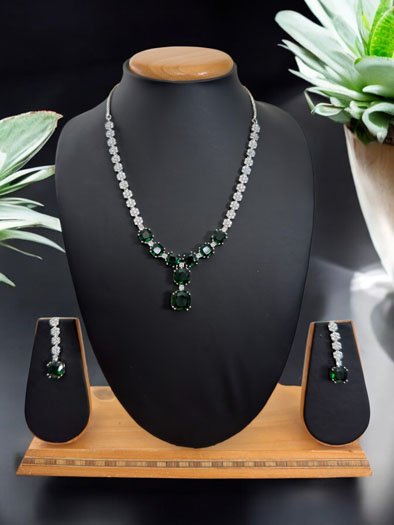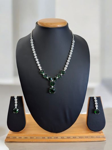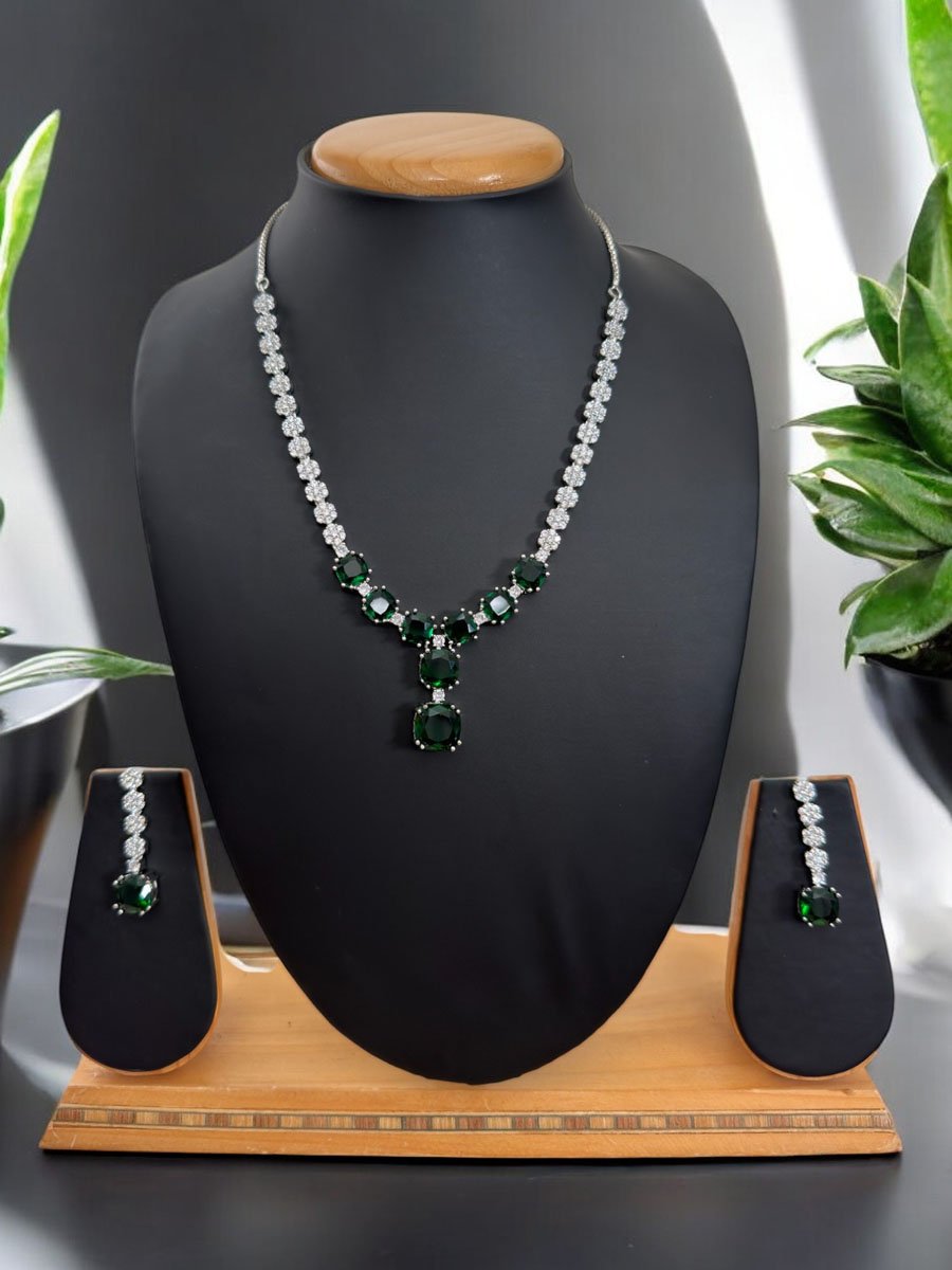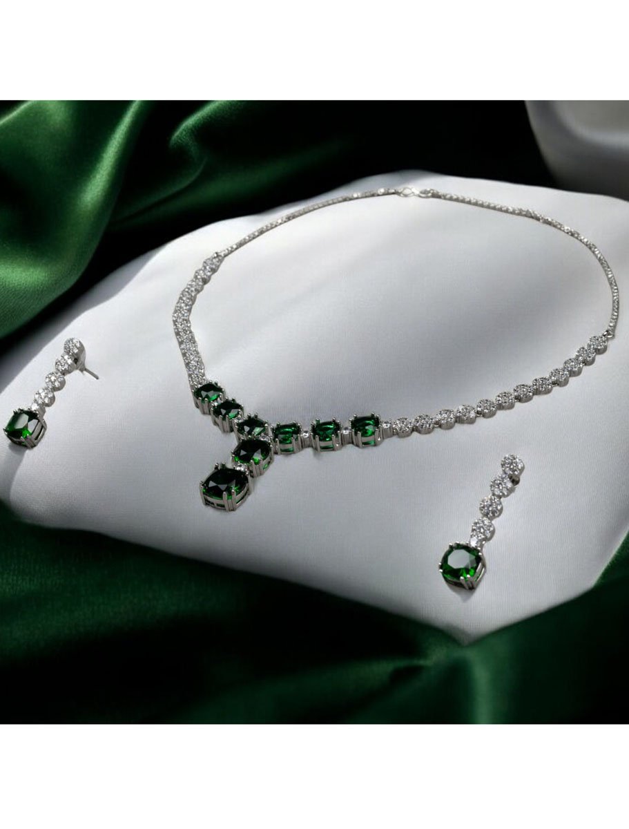 Enhance your elegance with this gorgeous Emerald CZ Pendant Necklace Set. This exquisite piece features high-clear cubic zirconia chain with Emerald American Diamond Pendant in white rhodium finish, creating a captivating sparkle. Handcrafted earrings complement the necklace, adorned with intricate CZ stones for a flawless finish. Perfect for any special occasion, this set embodies the essence of Indian jewelry craftsmanship. Shop this stunning necklace set online and experience the sophistication of American Diamond jewelry, a must-have addition to your collection!!