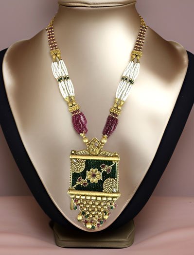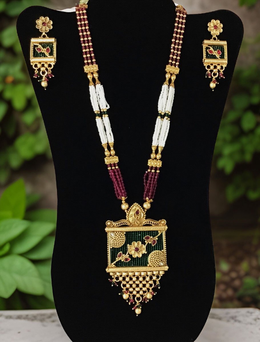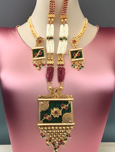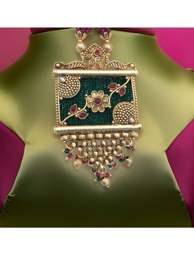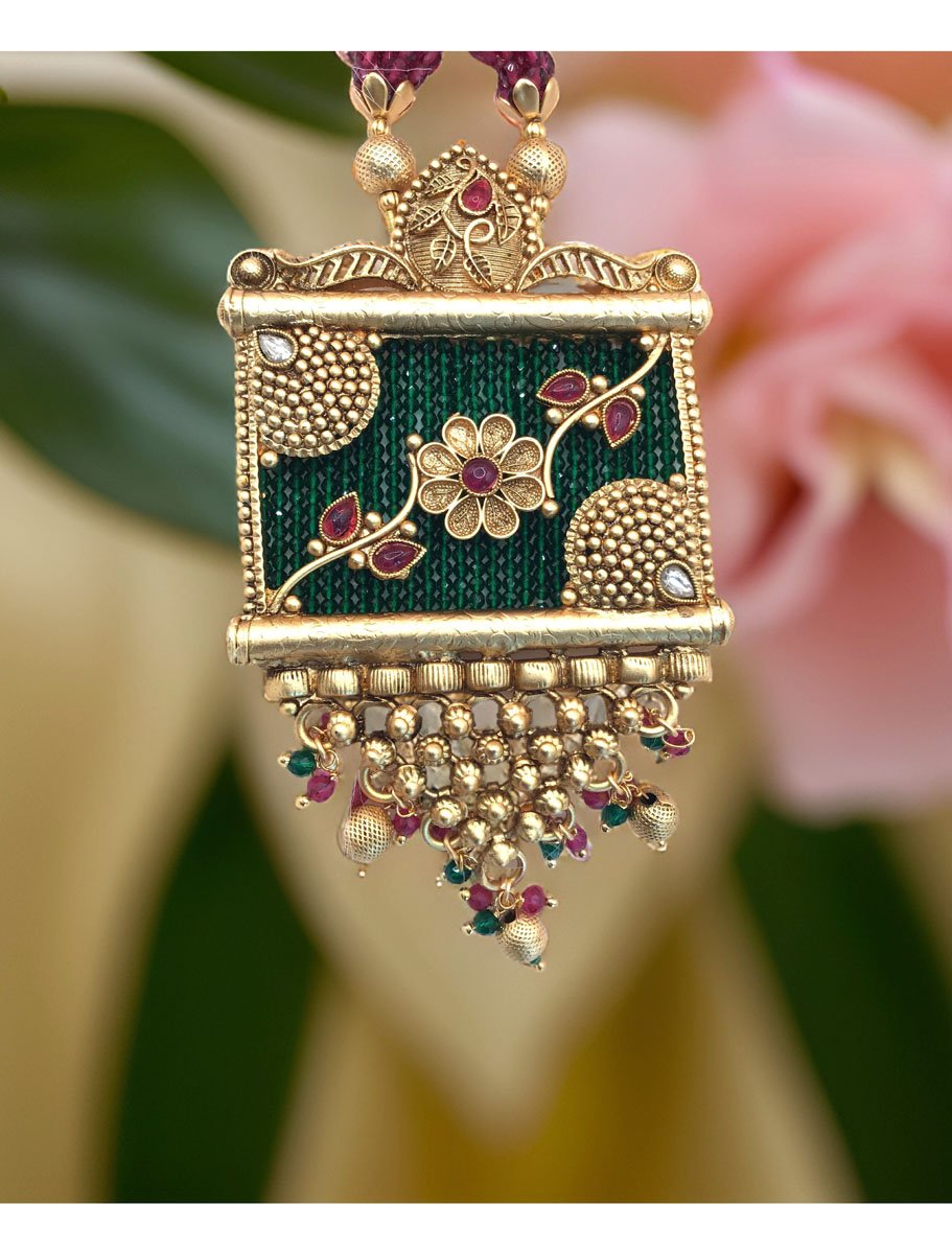 Indulge in the allure of the Polki Emerald Necklace with matching earrings. Crafted from Brass and plated with Antique Gold, this necklace showcases the beauty of Polki and Emerald Beads.