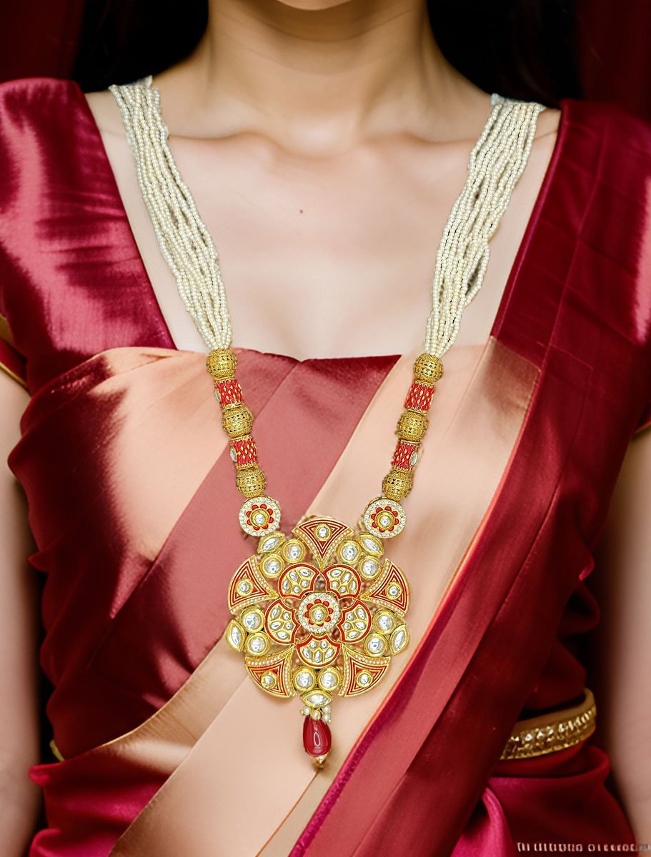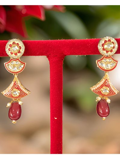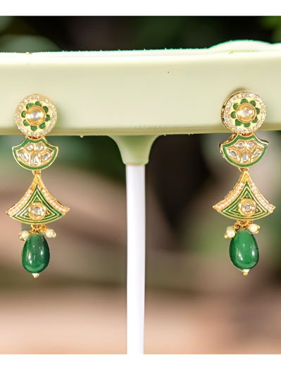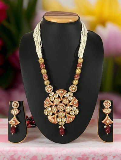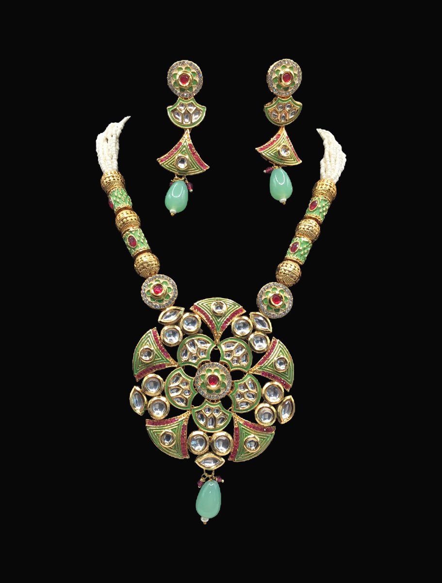Handmade designer meenakari set made in Brass and Pearls. Beautiful pendant is decorated with Green and Red meenakari and colorful stones. Floating onyx beads looks cute. Lightweight, comfortable on the neck. Earrings are also very light weight. Looks classy upon wearing. Perfect for festive season, party wear. Available in Mint Green, Green and Ruby Red colors.