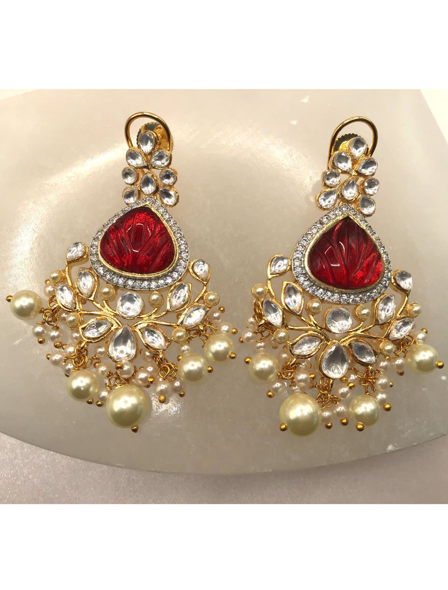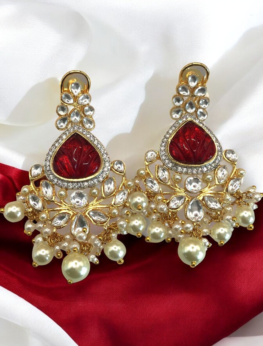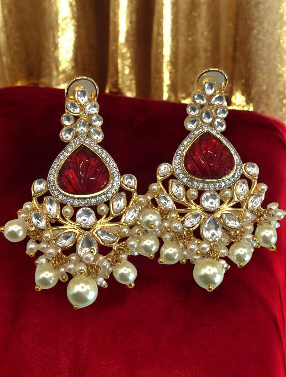 Elevate your style with these high-quality Kundan exclusive design earrings crafted from brass. They feature Kundan, CZ stones, and pearls, with a center Ruby stone that enhances their beauty. Perfect for party wear. Make a statement with these exquisite Kundan exclusive design earrings.