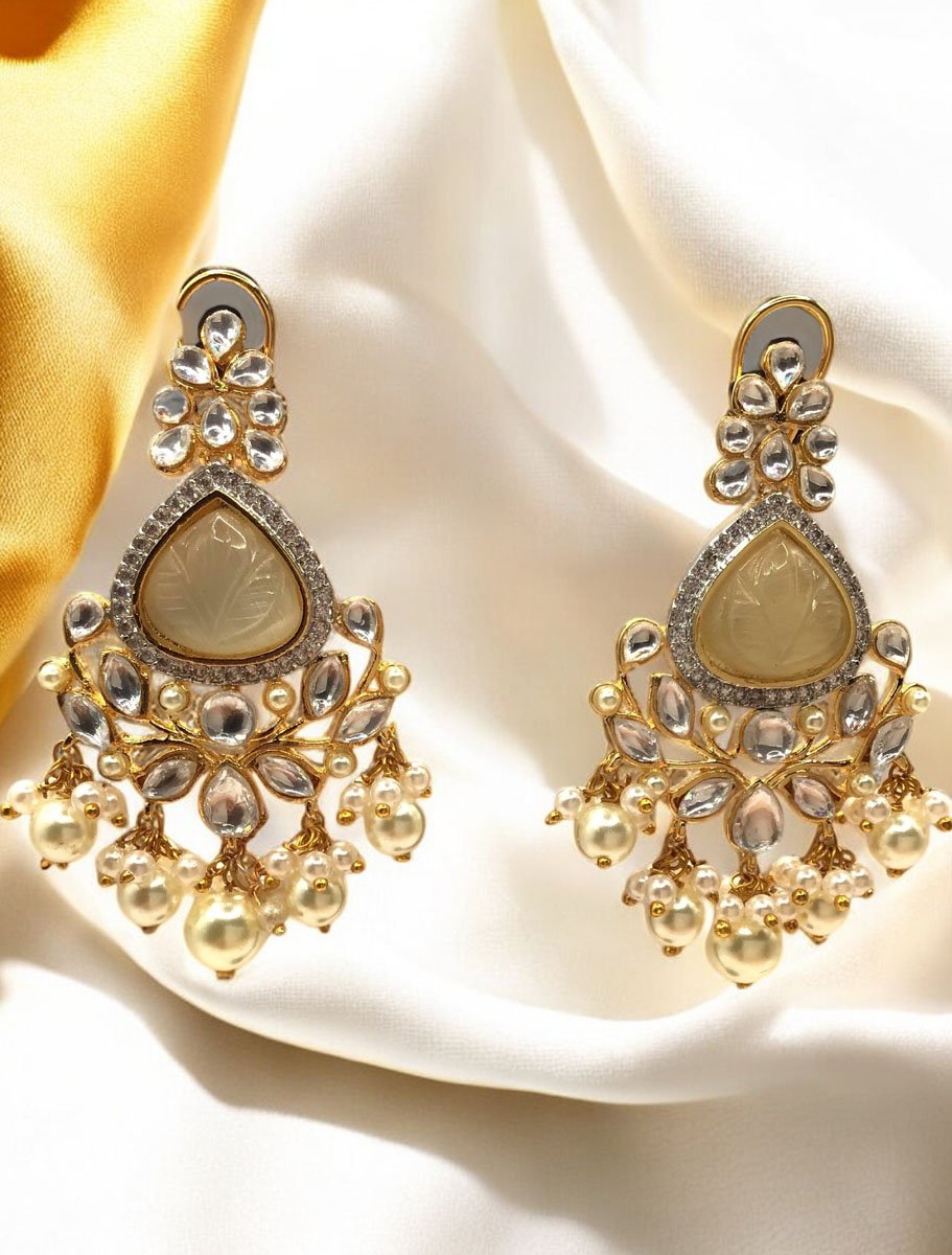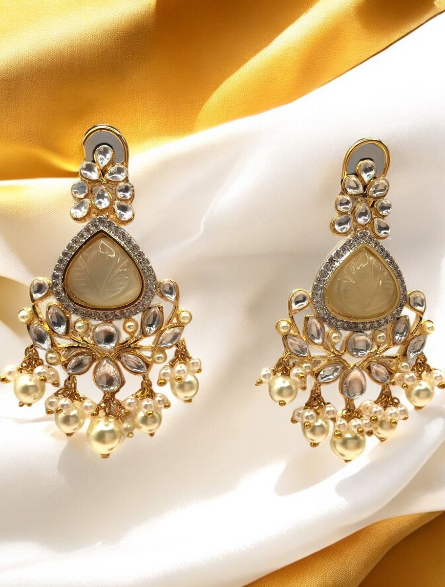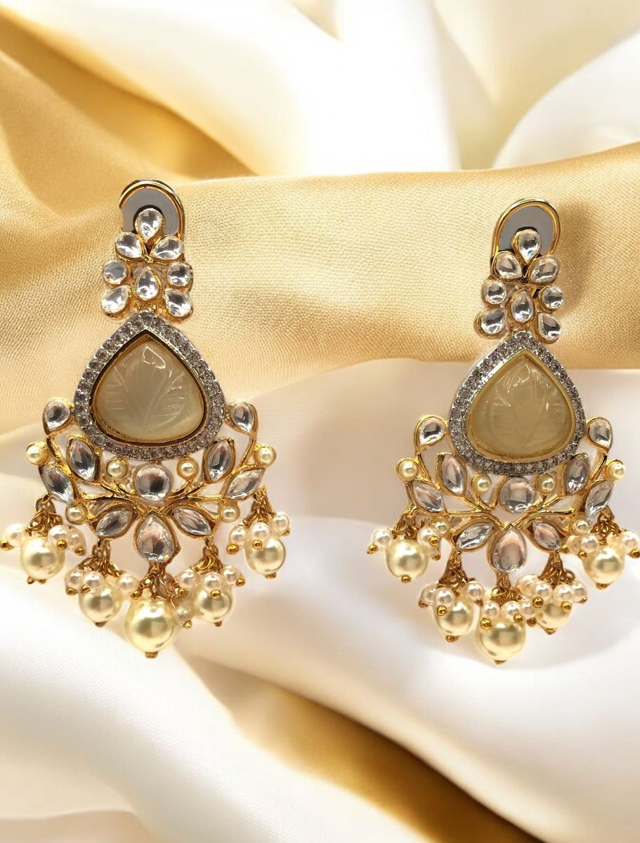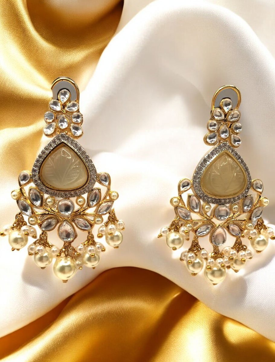 Elevate your style with these high-quality Kundan exclusive design earrings crafted from brass. They feature Kundan, CZ stones, and pearls, with a center Ruby stone that enhances their beauty. Perfect for party wear. Make a statement with these exquisite Kundan exclusive design earrings.