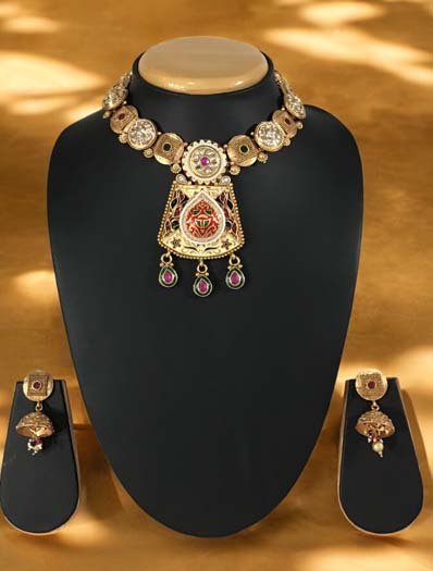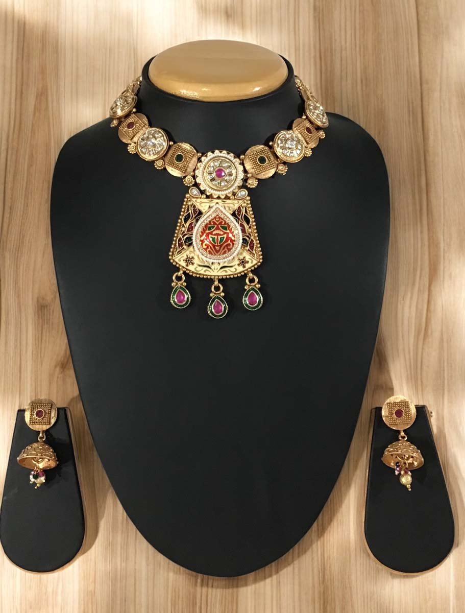Inspire your style with Antique Gold Finish Rajwadi style choker set with detailed Red/Green/White meenakari work and Ruby Red/Green Golden drops.This Beautiful necklace with brass in gold replica designs to give you that Rajwadi and Ethnic look for your special occasions. Create beautiful memory for any occasion with elegant jewelry for your loved ones!