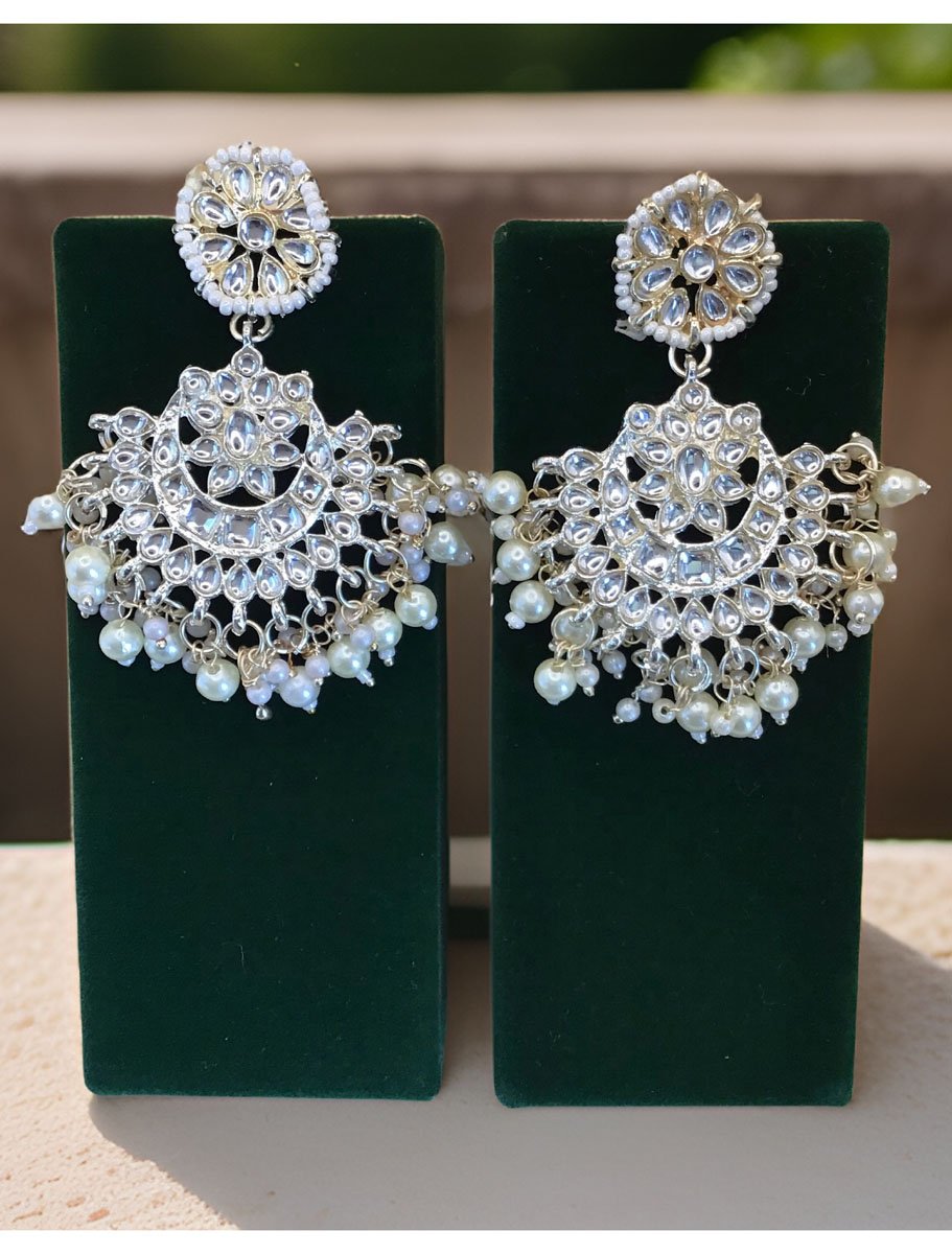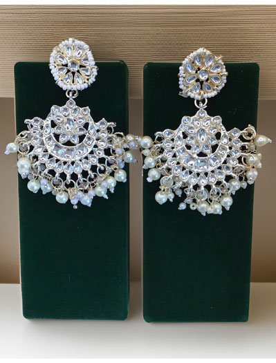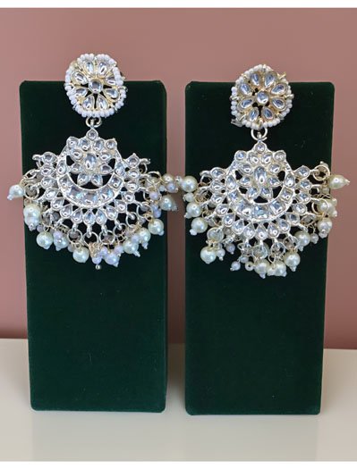 These Kundan drop earrings are adorned with Kundan and white pearls, making them the perfect choice for all occasions. Enhance your elegance with these exquisite Kundan drop earrings.
