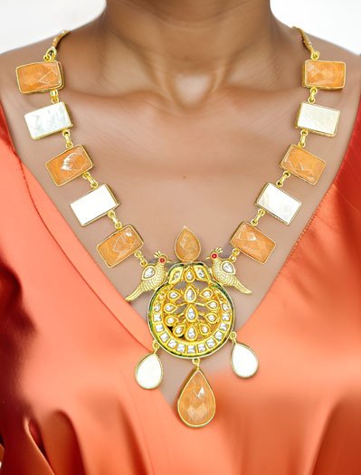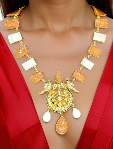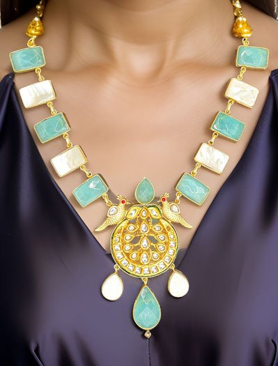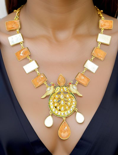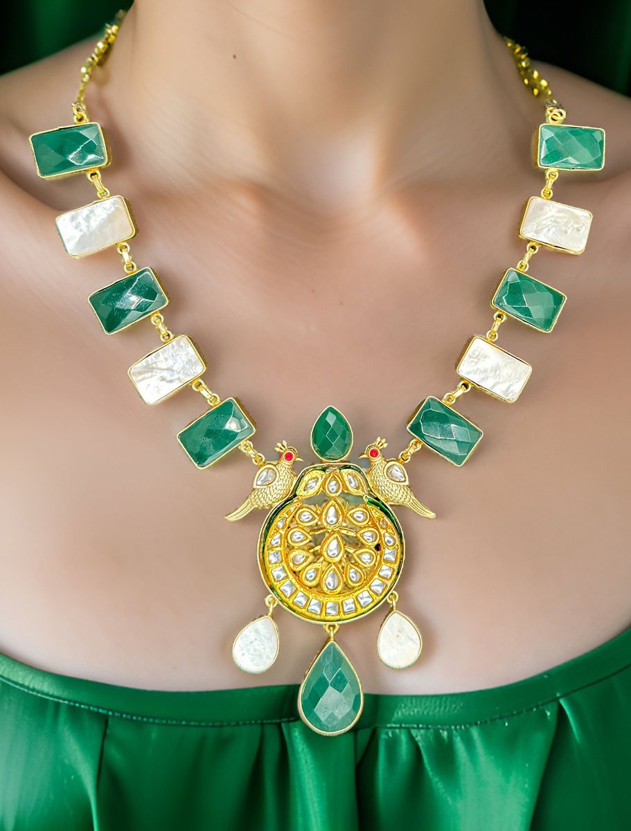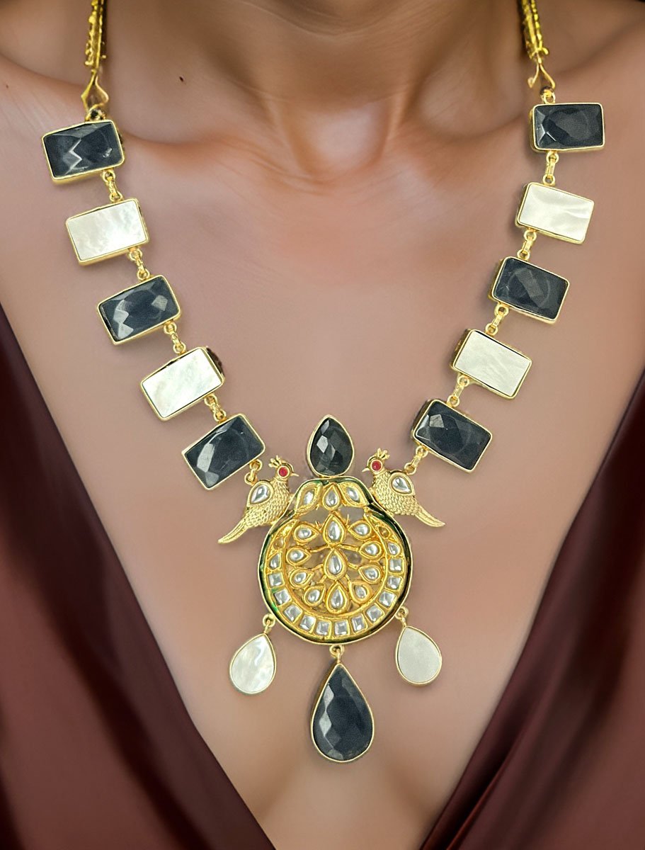 Enjoy the beautiful Fringe Necklace Set with our lovely Mother of Pearls and Premium Quality Kundan. A necklace for a perfect finishing touch on your outfit of the day, everyday! This necklace features natual flat shaped Mother of Pearls and It's beautiful pendant is embellished with Premium Kundan and 2 cute birds. Natural Mother of Pearl beads exhibit captivating colors and a brilliant shine. Share the allure of nature with a loved one. Perfect for any occasion, from casual outings to special events, this bracelet complements various looks, adding a touch of sophistication!