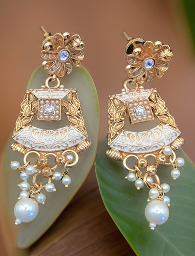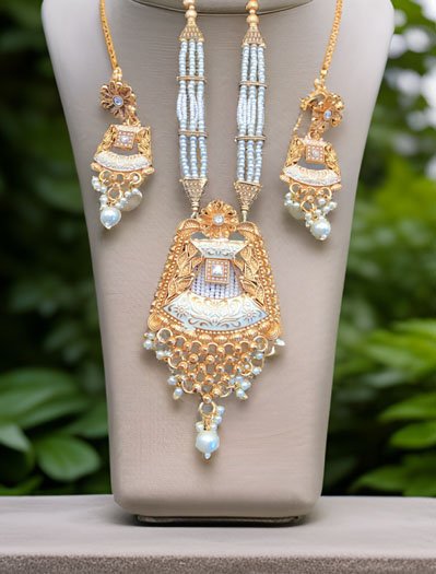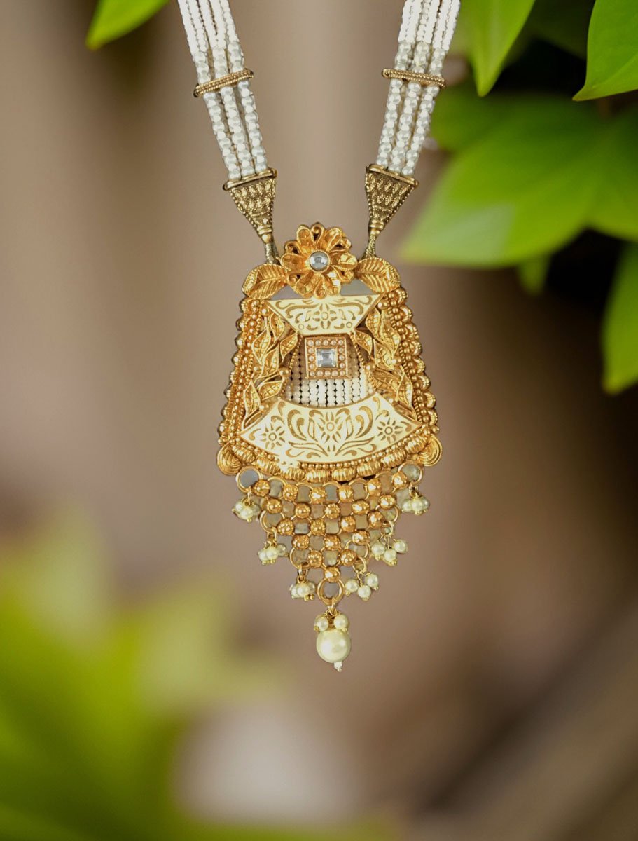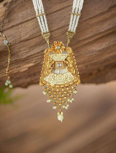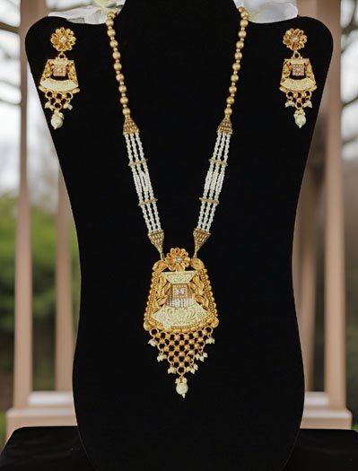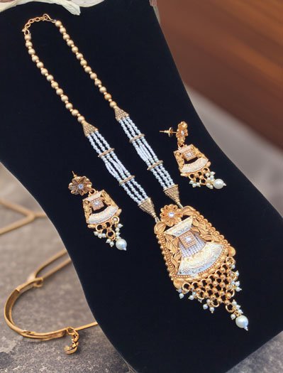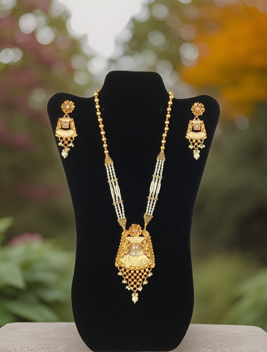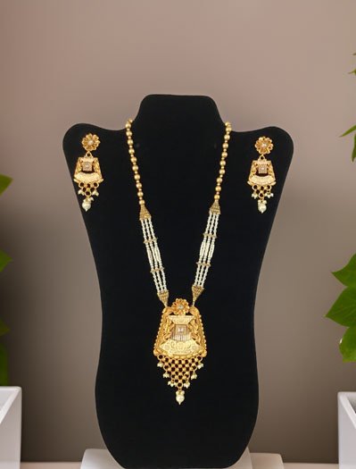 Gold Finish Rajwadi Long necklace set with pearl drops