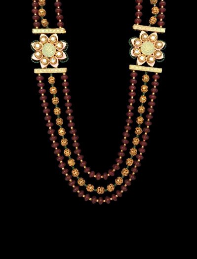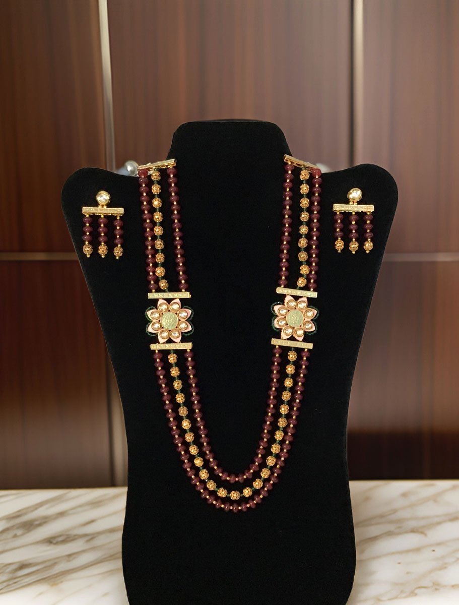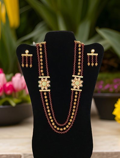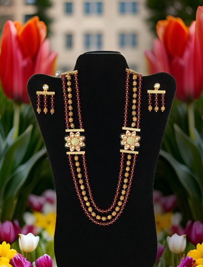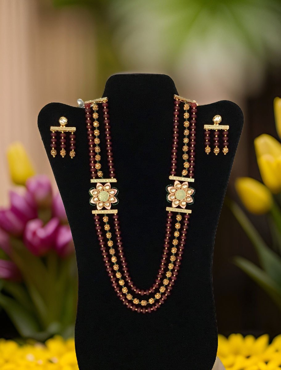 Bollywood inspired stylish yet traditional Golden Red Green Beaded 3 layered long mala set. Top quality pearls, golden hydro onyx beads with nicely crafted meenakari flowers in the center makes this all in one design. Very Elegant and stylish, This necklace can be paired with any traditional Indian or Western Attire depending upon the occasion and the theme.