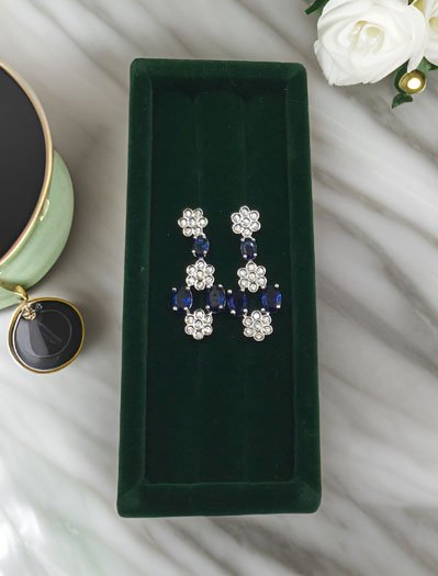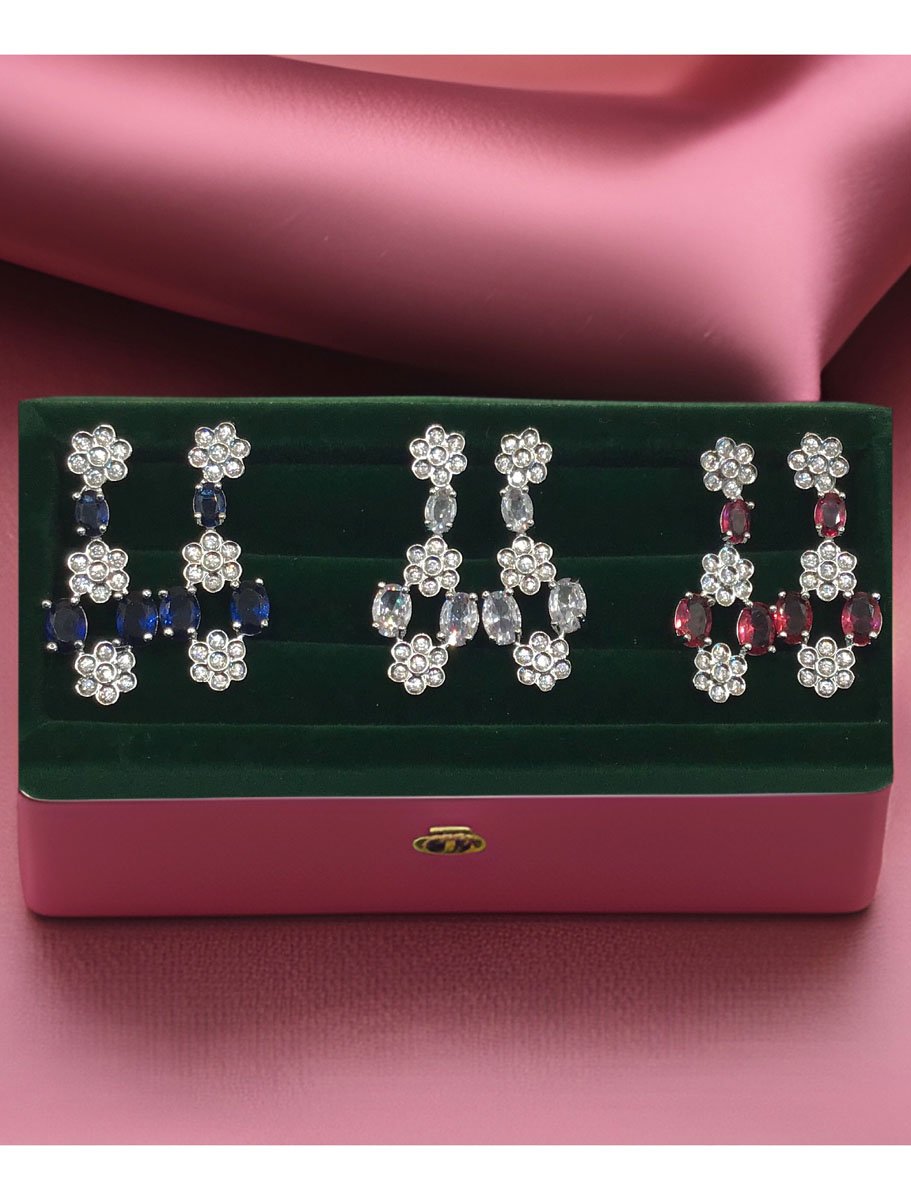 AD/CZ Earrings are stunning display of elegance and glamour. Crafted with precision and adorned with dazzling CZ stones, these earrings effortlessly enhance your beauty and make a statement. Available in Ruby, Sapphire Blue and Clear colors.