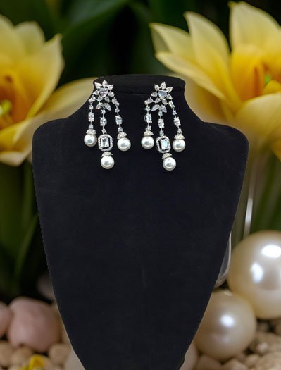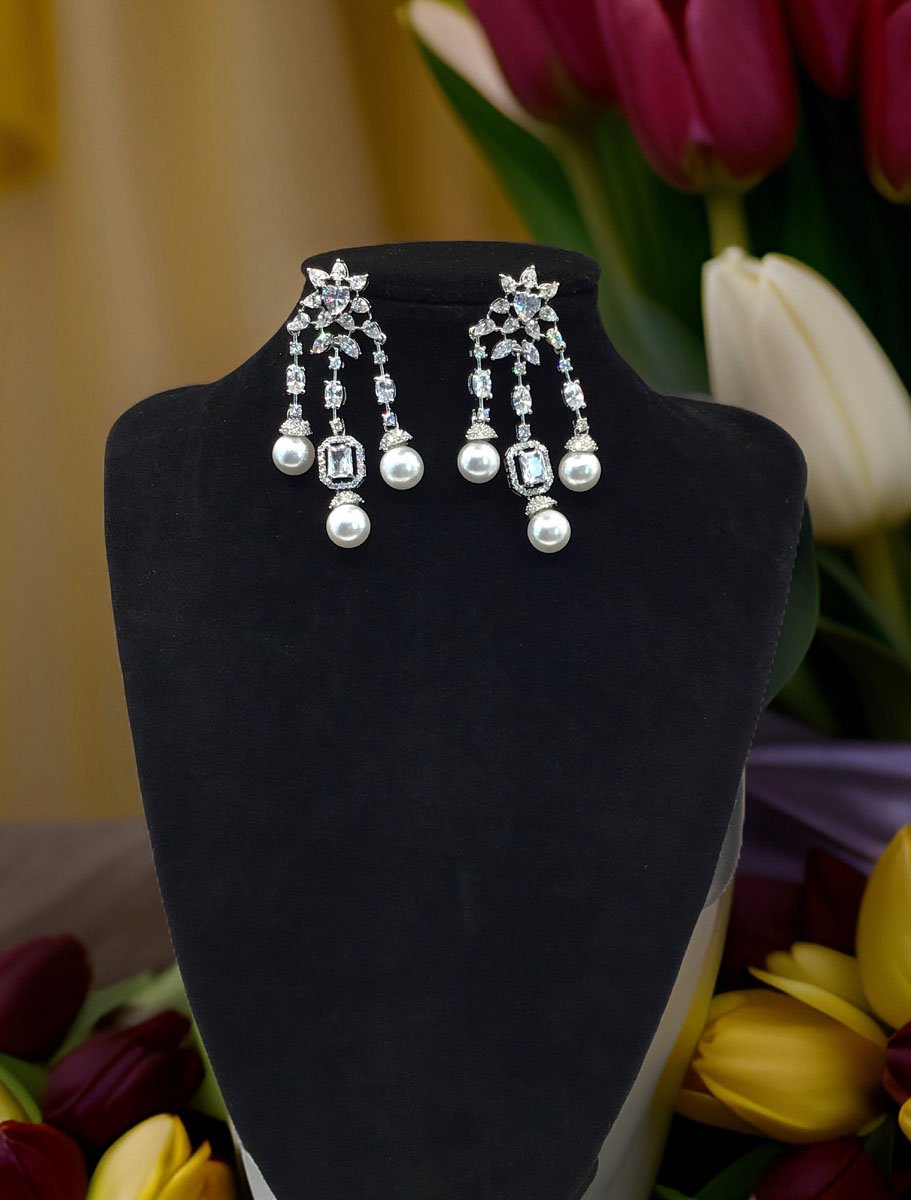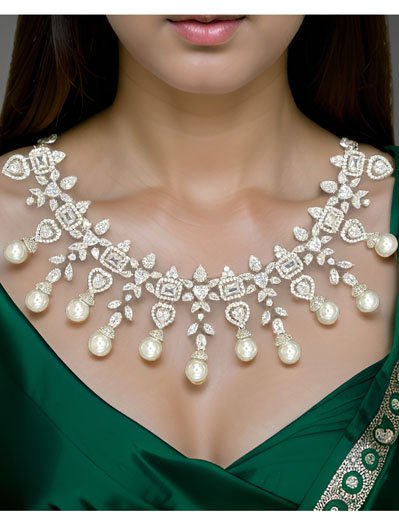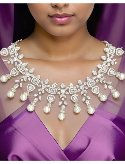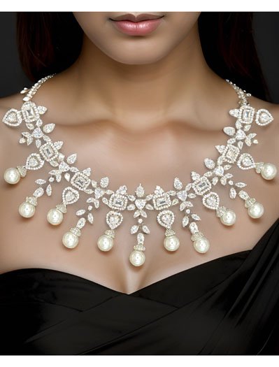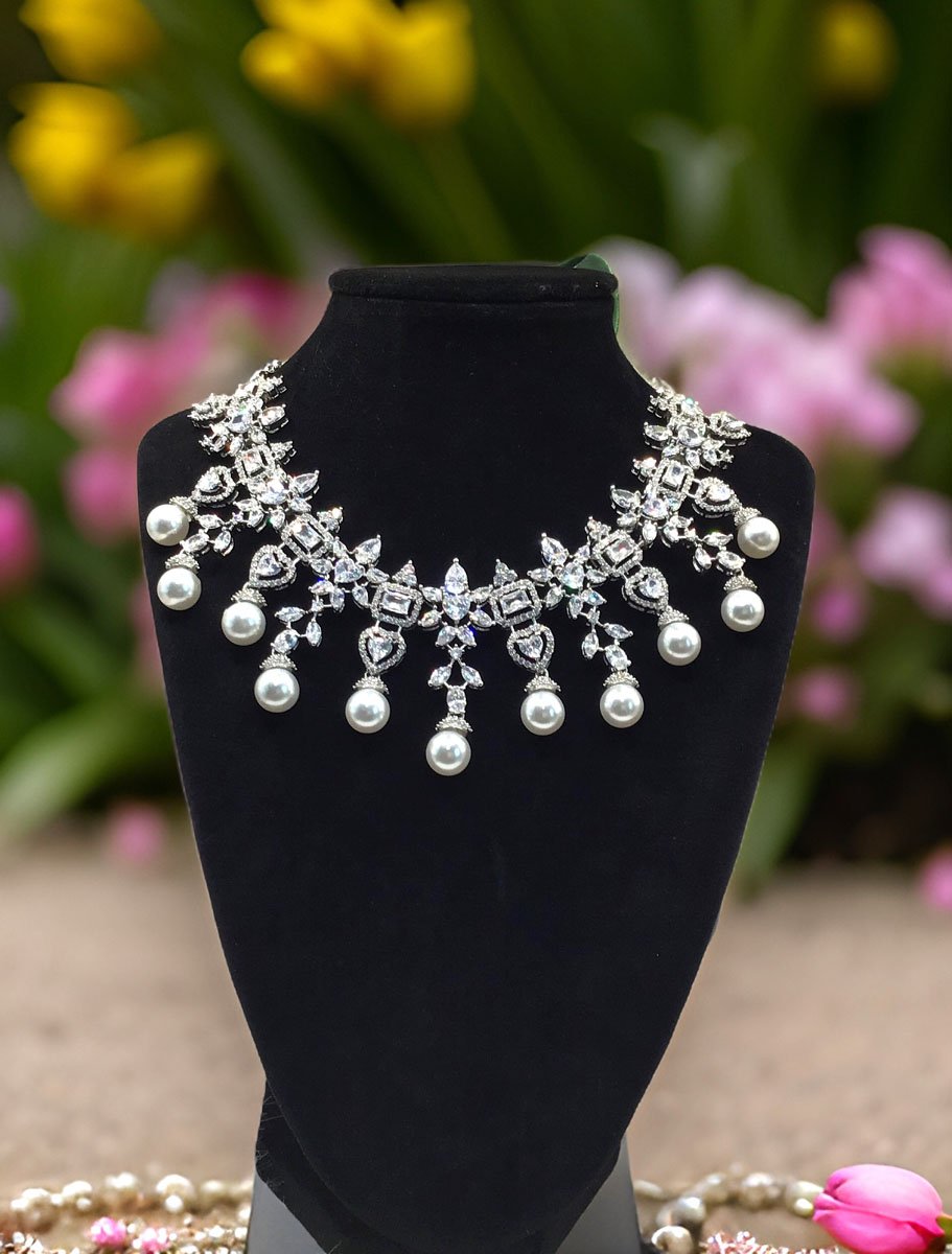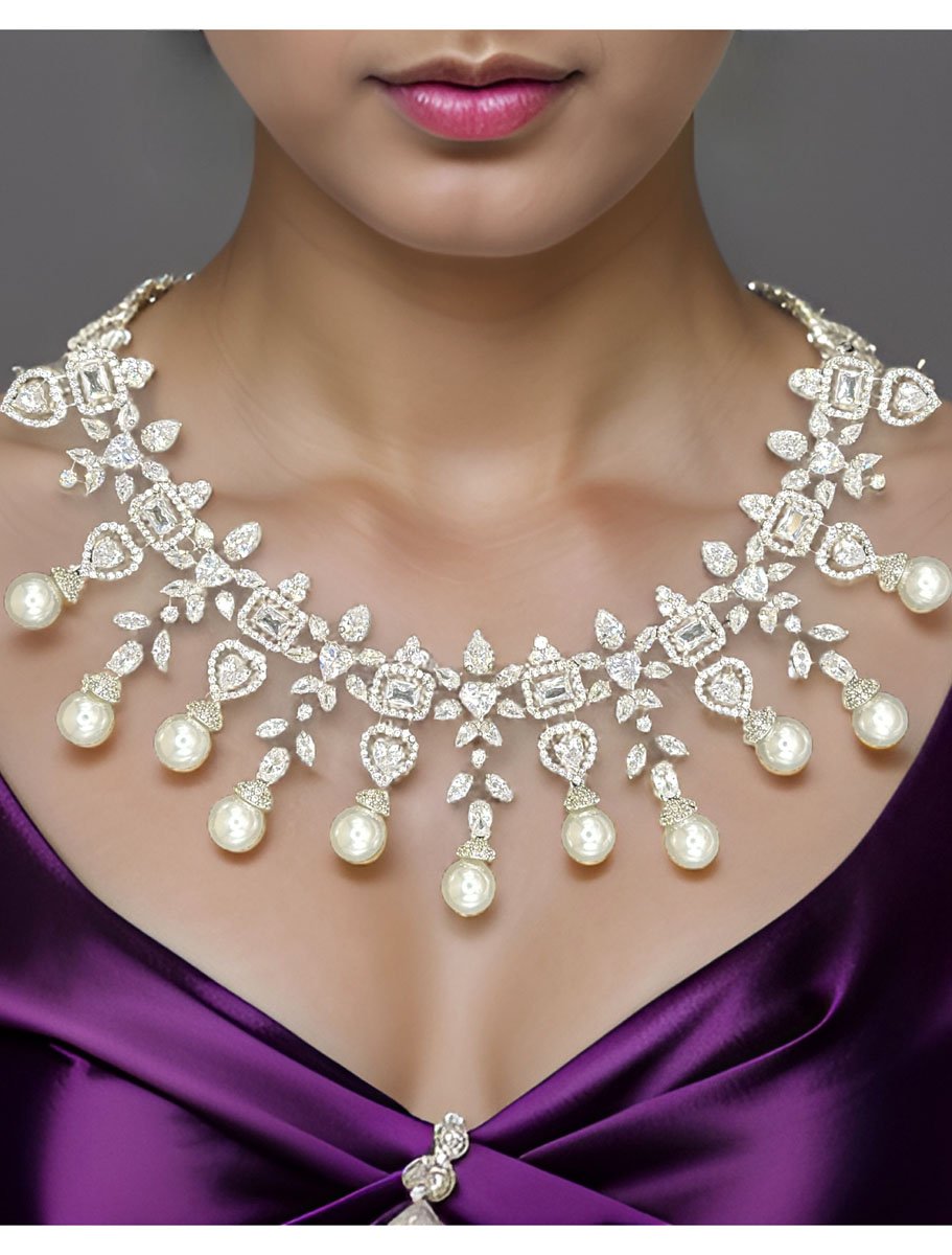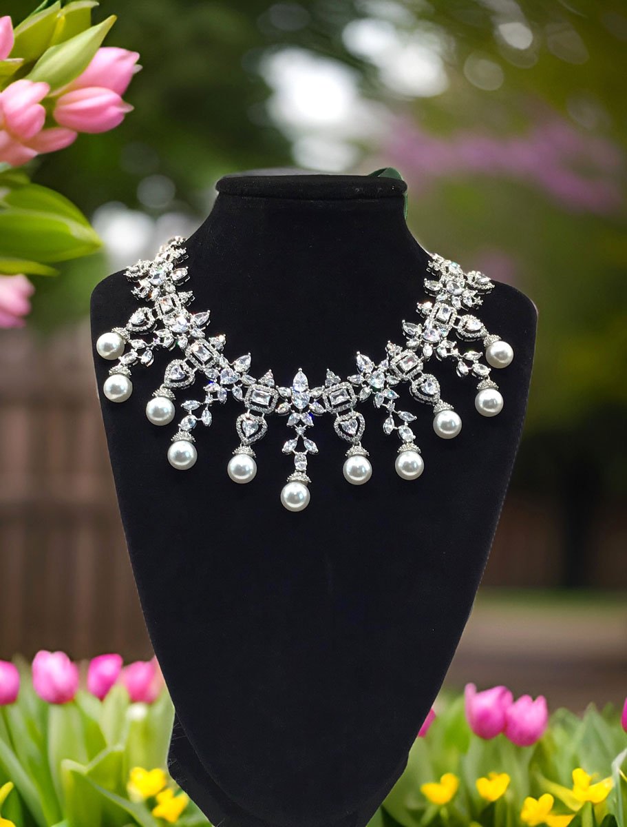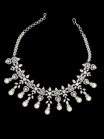 Gorgeous fine quality lab diamonds studded choker with pearl drops necklace in white rhodium plating and matching earrings. I1005. Necklace Fitting is adjustable.